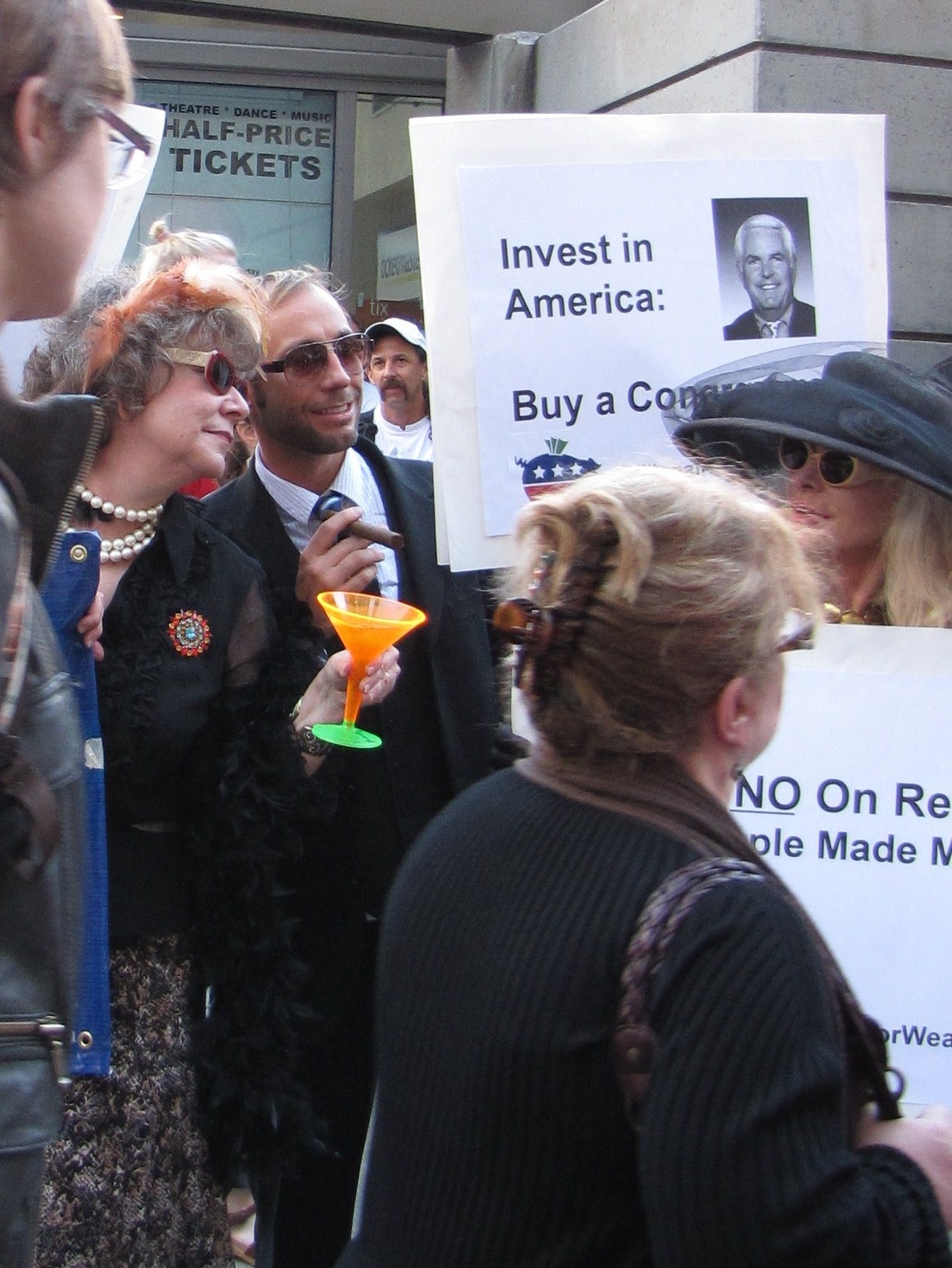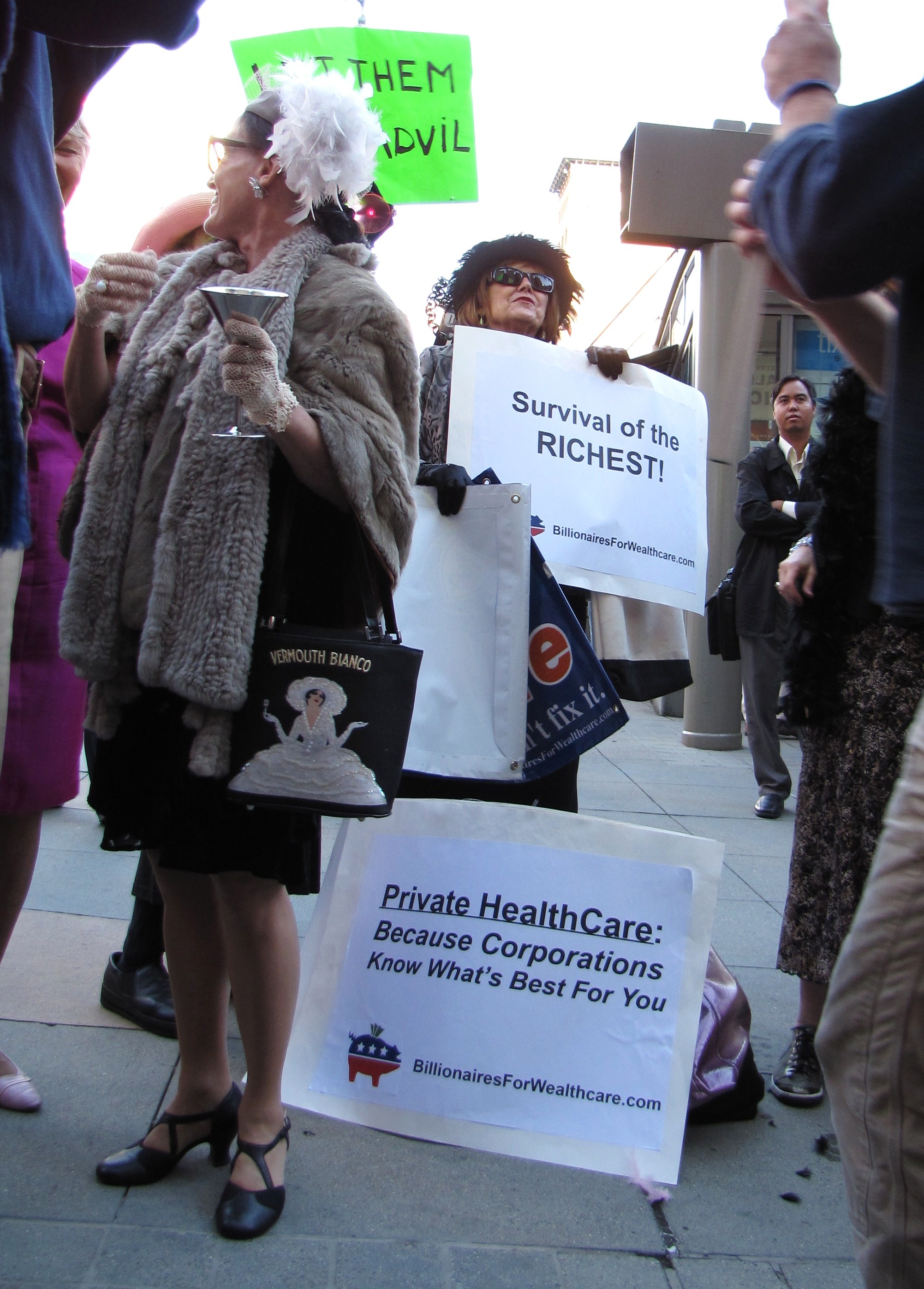 When President Obama came to San Francisco on October 15 not ALL the high fashion was within the St. Francis Hotel where he spoke. Amongst the crowd of over a thousand demonstrators lining the sidewalk across the street from the hotel, a group of about ten "Billionaires for Wealthcare" stood out in their finery.