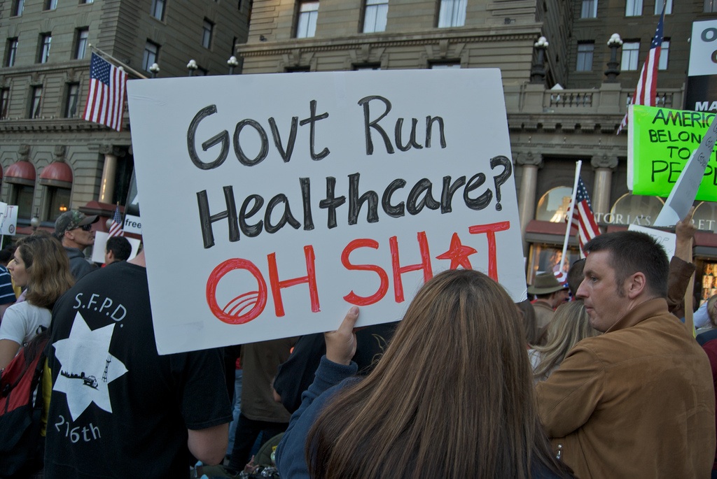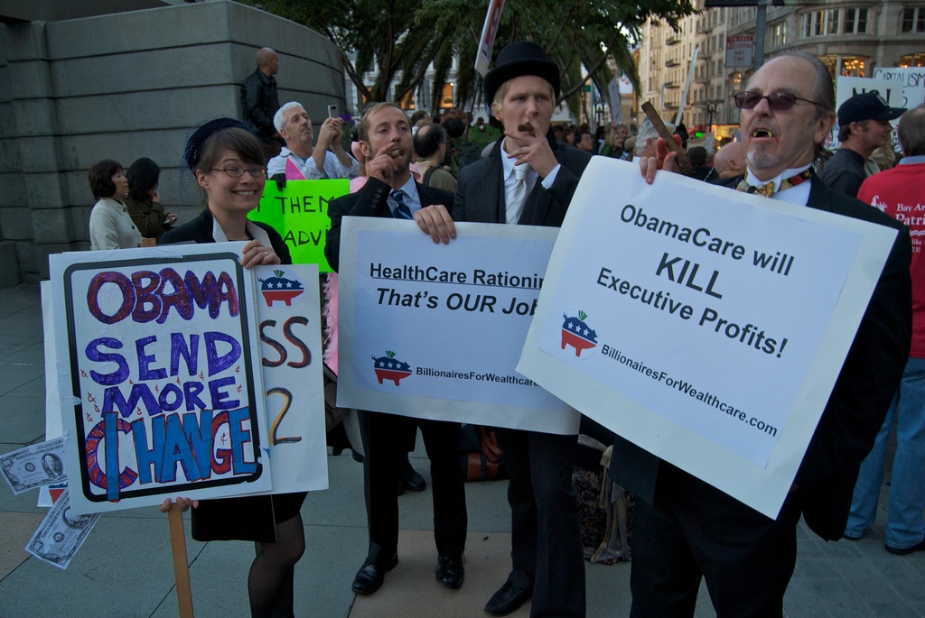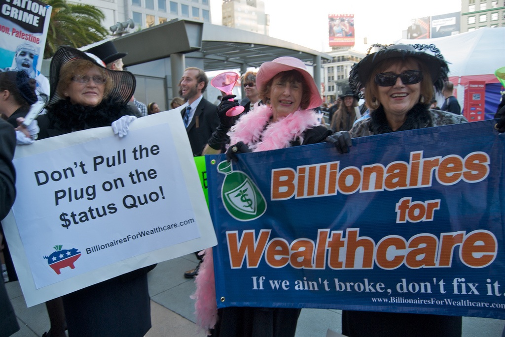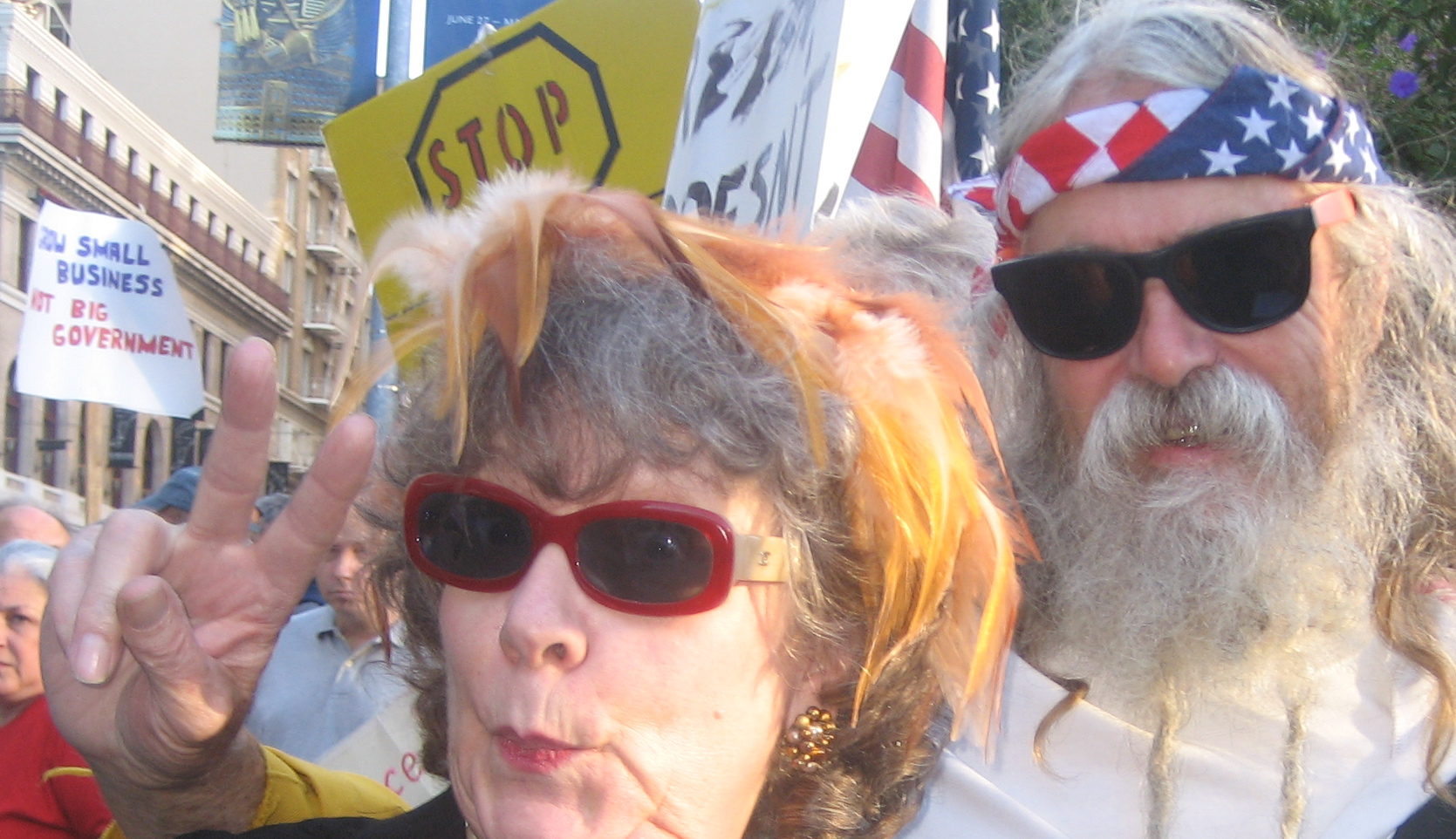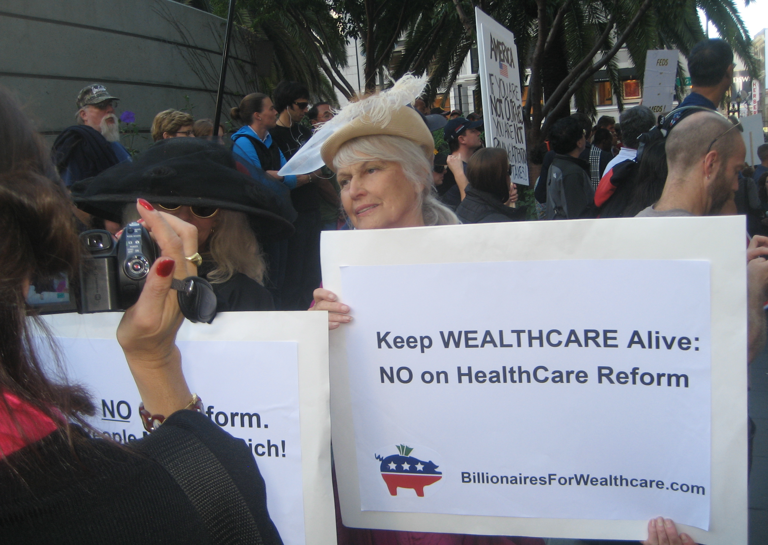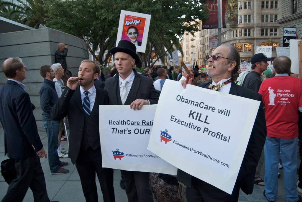 Top Photo by Steve Rhodes: Billionaires for Wealthcare Ape the Rich while Teabaggers face the St. Francis with Kool-Aid sign and Tea Party T-shirts