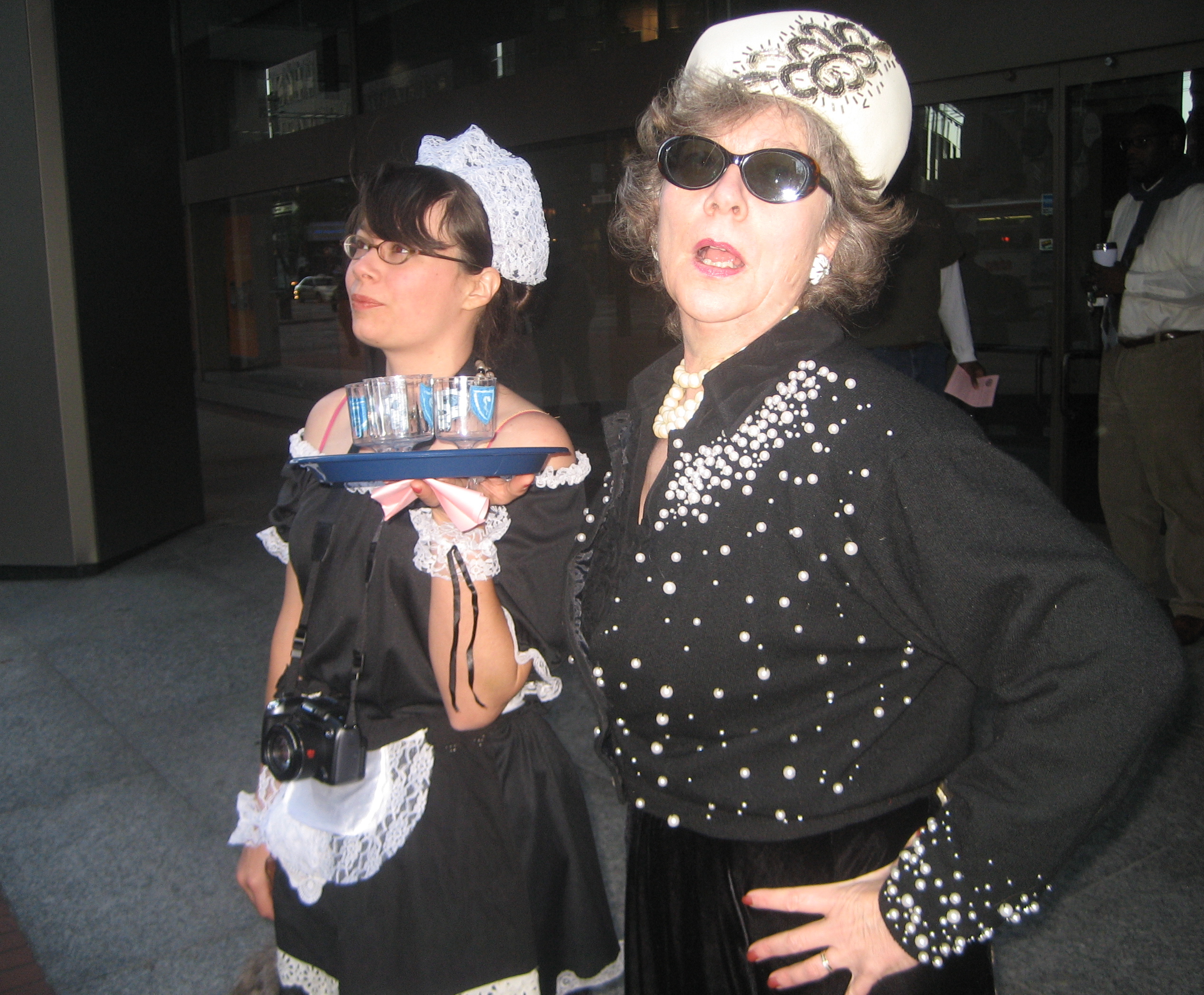 About 200 people demonstrated with surprises for Blue Shield in San Francisco today to demand that the company stop blocking health care reform. Street theater props included a giant Octopus of Death and cigars for the "Billionaires for Wealthcare". The Billionaires were accompanied by their own French maid Fifi who served them in wine glasses emblazoned with the Blue Shield logo.