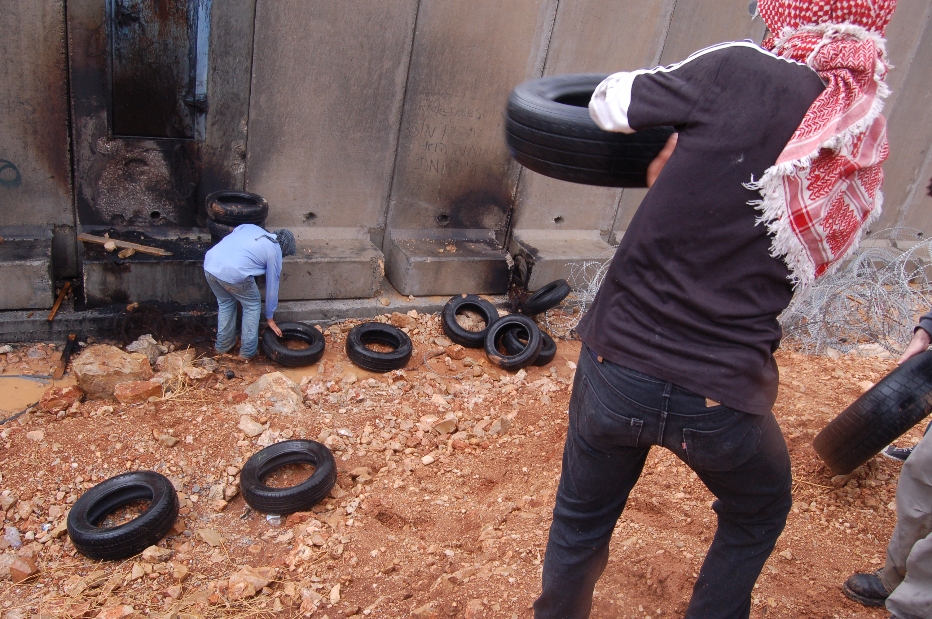 from the Anarchists Against walls Media: "Ni'lin's first winter protest was held under heavy rainfall. Consequently, the number of protesters was smaller thanusual, and consisted of a few dozen Ni'liners, ten israelis and a similar number of internationals. Some of the demonstraters set fire to a large pile of tires placed near the wall's concrete slabs. The combination of heat and humidity seemed to have cracked parts of the concrete. A number of protesters clashed with the soldiers guarding the fence, who fired volleys of tear gas and squirted the "Skunk" which was particularly potent in stench. No injuries were recorded aside from gas inhalation, and the protest ended earlier than usual."
