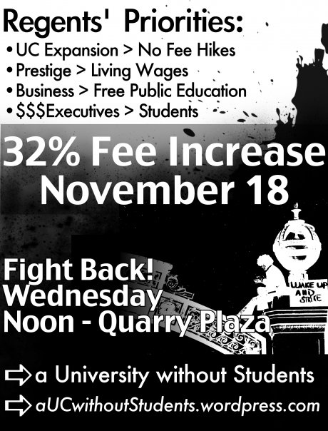 On November 18th, we, the UC students, refuse to remain silent. We refuse the methods the UC office of the president and the UC Regents are employing to restructure the university and cut funding; this is simply unacceptable. We will not allow business to continue as usual; we will show the administrators what the consequences of unjustified fee hikes and cuts to necessary programs will look like, a university without students.