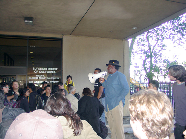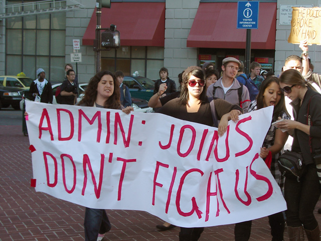 A rally was held on Monday, November 23rd, at Wheeler Hall to protest the police brutality that occurred the previous Friday during the occupation at UC Berkeley. Students then marched to BART and proceeded to the Wiley court house in Oakland to show solidarity with those arrested on Friday. From there, students marched to the headquarters of Oakland PD who were present on Berkeley campus on Friday and then to UC's Office of the President to push for a meeting with the president to discuss police abuses against students.