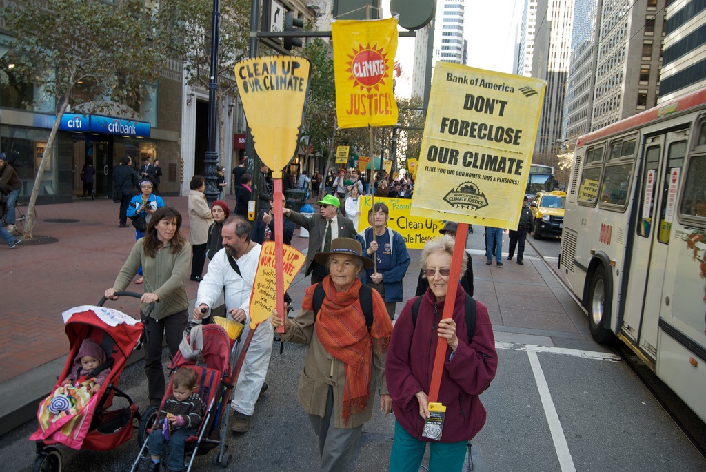 On November 30 in the lead-up to the climate talks in Copenhagen, protesters rallied and marched to Bank of America's skyscraper building. They shut down entrances for much of the middle of the day. There were more than 20 arrests.