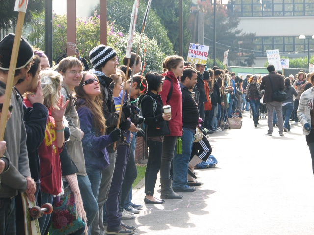 Students occupied the business building this morning at San Francisco State University. The students are protesting the budget cuts, fee increases, lay offs in the public sector, and privatization of public education. They are still occupying as of 2:10 PM and plan on staying until their demands have met. While police intimidation in the morning has been relatively lax as of now, students plan on defending the space in the instance that there is an attempt to forcibly evict the occupiers. All day students outside have rallied in support, demonstrated with music, held hands in unity, and debated some right-wing business students. OCCUPY EVERYTHING