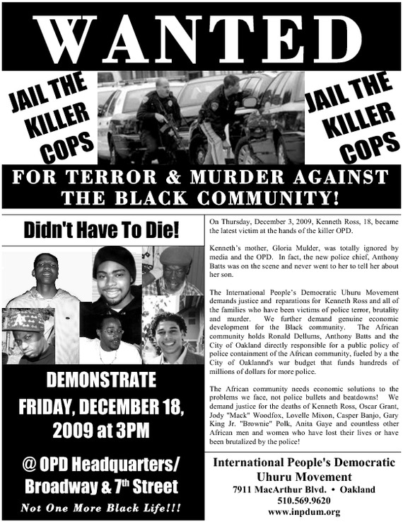 Join the International People's Democratic Uhuru Movement will demonstrate on tomorrow, Friday, December 18th, 2009 at 3pm in front of the Oakland Police Department Headquarters at 7th and Broadway to protest the police killing of 18 year old Kenneth Ross and to demand justice and reparations to all victims of the policy of police containment.