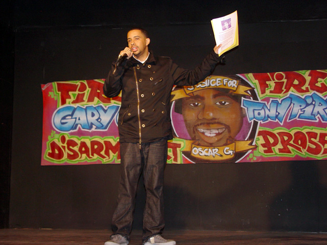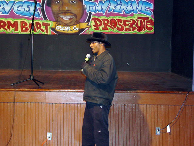 Tony Coleman MCd the event. Speakers and performers included Dr. Ramona Tasco - Faith Speaker; Rev. Humphreys - Faith Speaker; Boots - Rap (acapella); Min. Keith - Faith Speaker; Andrea - Song; Miss Jada Simone - Song; Salih Muhammad - Faith/Youth Speaker; David from Revolution Club - Speaker (held at juvenile hall after Oscar Grant rebellion till public protest got him released); Opi - Spoken Word, also with Revolution Club; Hannibal - Speaker, Oakland Assembly; Diamond and Silence the Violence - Rap (ensemble); Cat - Spoken Word; Diva - Song; Dee Allen - Spoken Word (UC8 arrestee); Dumpster - Spoken Word; Usual Suspects, project of the Paid Poets Society - Poetry; Black Azz - Comedy; J.R. - Speaker & Intro Mumia CD (still facing bogus felony charges from Oscar Grant rebellion); Mumia Abu Jamal, pre-recorded speaking about Oscar Grant case; Baby Jamaica - Rap; Kevin Cooper Letter - Read by Askari X's daughter, w/ Silence the Violence; Mistah F.A.B. - Showed Tribute Video; Be Real, Be Funny - Comedy; JACK - Speaker + Cephus; Selassie - Rap; B Janky of Trunk Boiz - Rap; Ise Lyfe - Spoken Word; Sherri - Poetry; Don Juan - Speaker, Oakland Assembly, host organization (which includes many individuals & organizations).