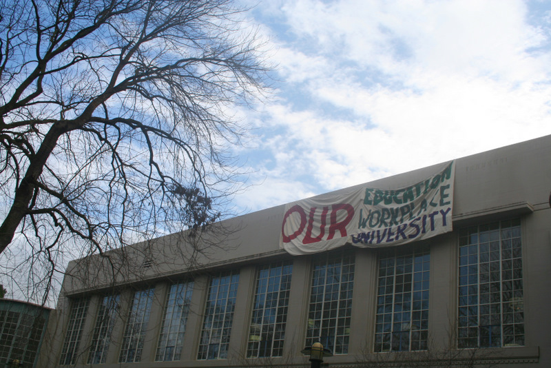 In the context of a rally and march in protest of the 32% fee increase implemented by the UC Regents and the UC’s unfair labor practices, protesters hung two large banners from the rooftop of UCD’s main library, Peter J. Shields, at noon today.