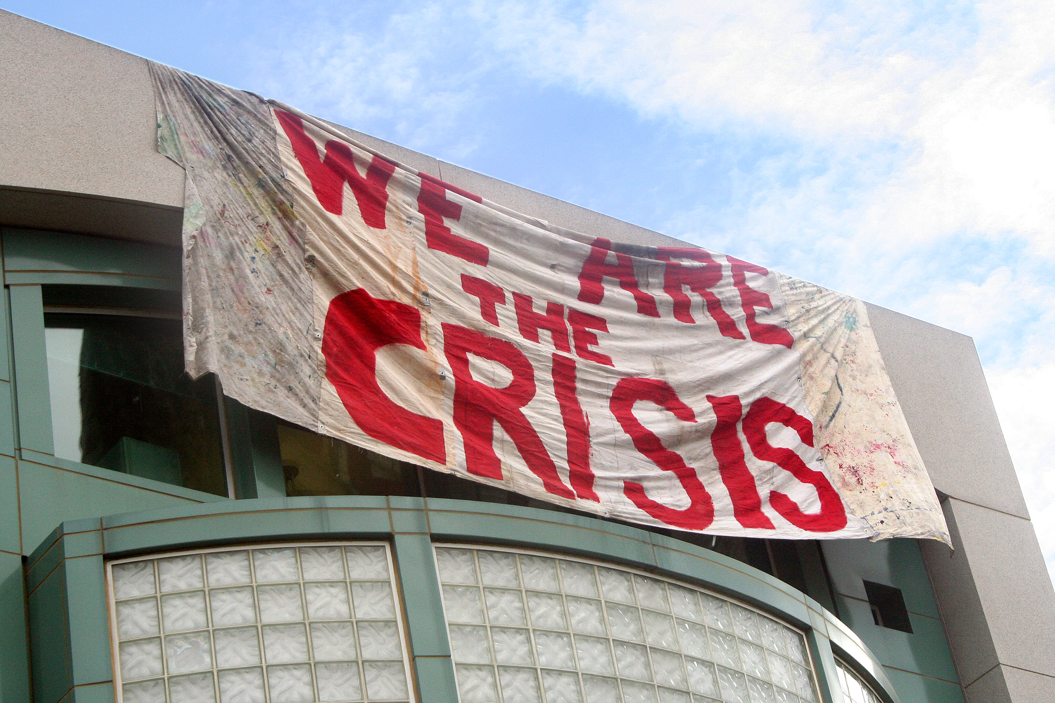 On January 12, 2010 two banners were strategically placed on the UC Davis main library, reclaiming public space as well as announcing Happy New Year to the administrators who hoped we would disappear. The banners read “We are the crisis” and “Our education, our workplace, our university”