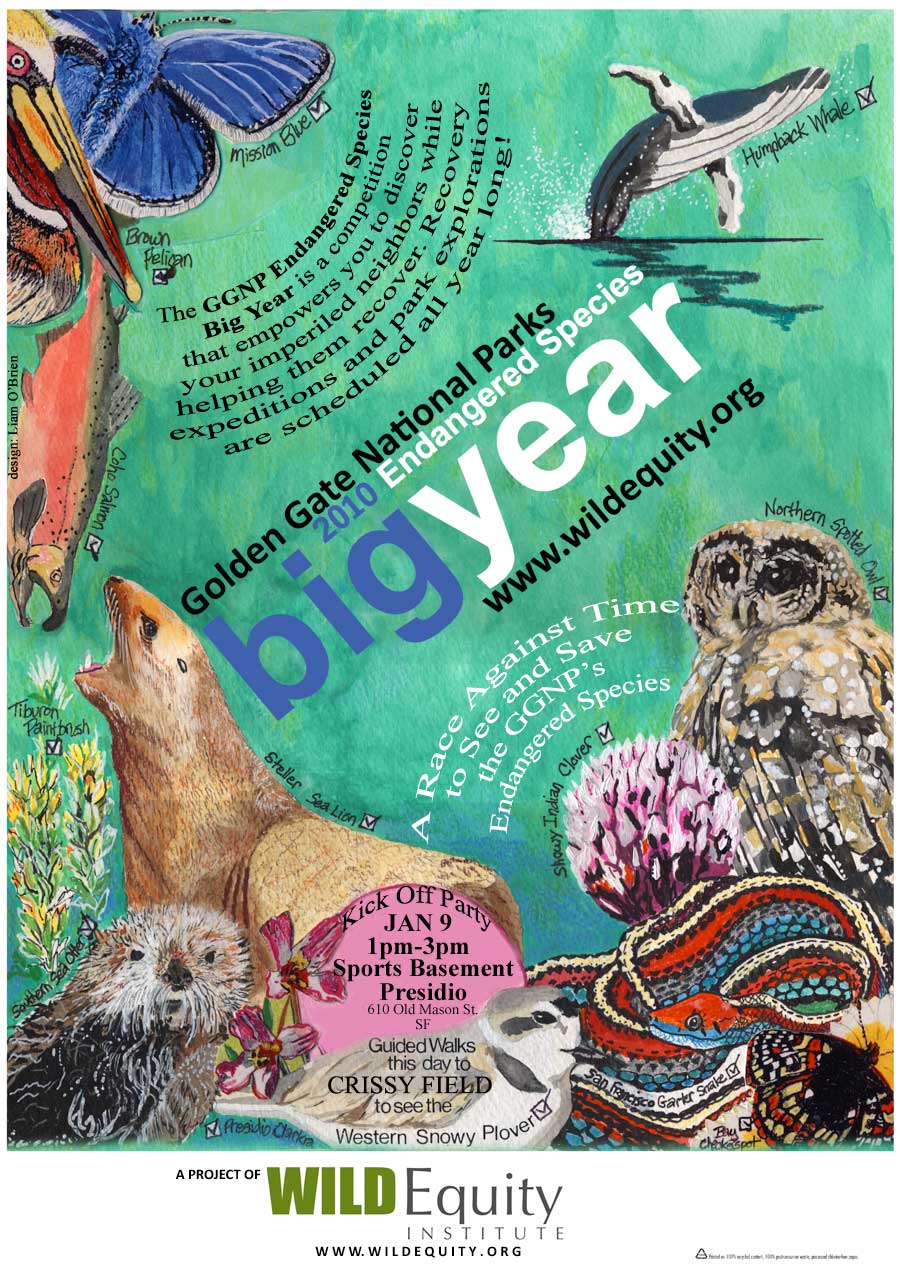The Golden Gate National Parks Endangered Species Big Year is a race against time to observe each of the 36 endangered and threatened species found within the Golden Gate National Parks, while taking 36 discrete conservation recovery actions that will help prevent these species from going extinct. It is a free competitive event where the person who sees and helps the most species between January 1, 2010 and December 31, 2010, will win the Big Year. Signup for the Big Year at http://www.wildequity.org and go to the calendar to see the upcoming Big Year trips and activities.