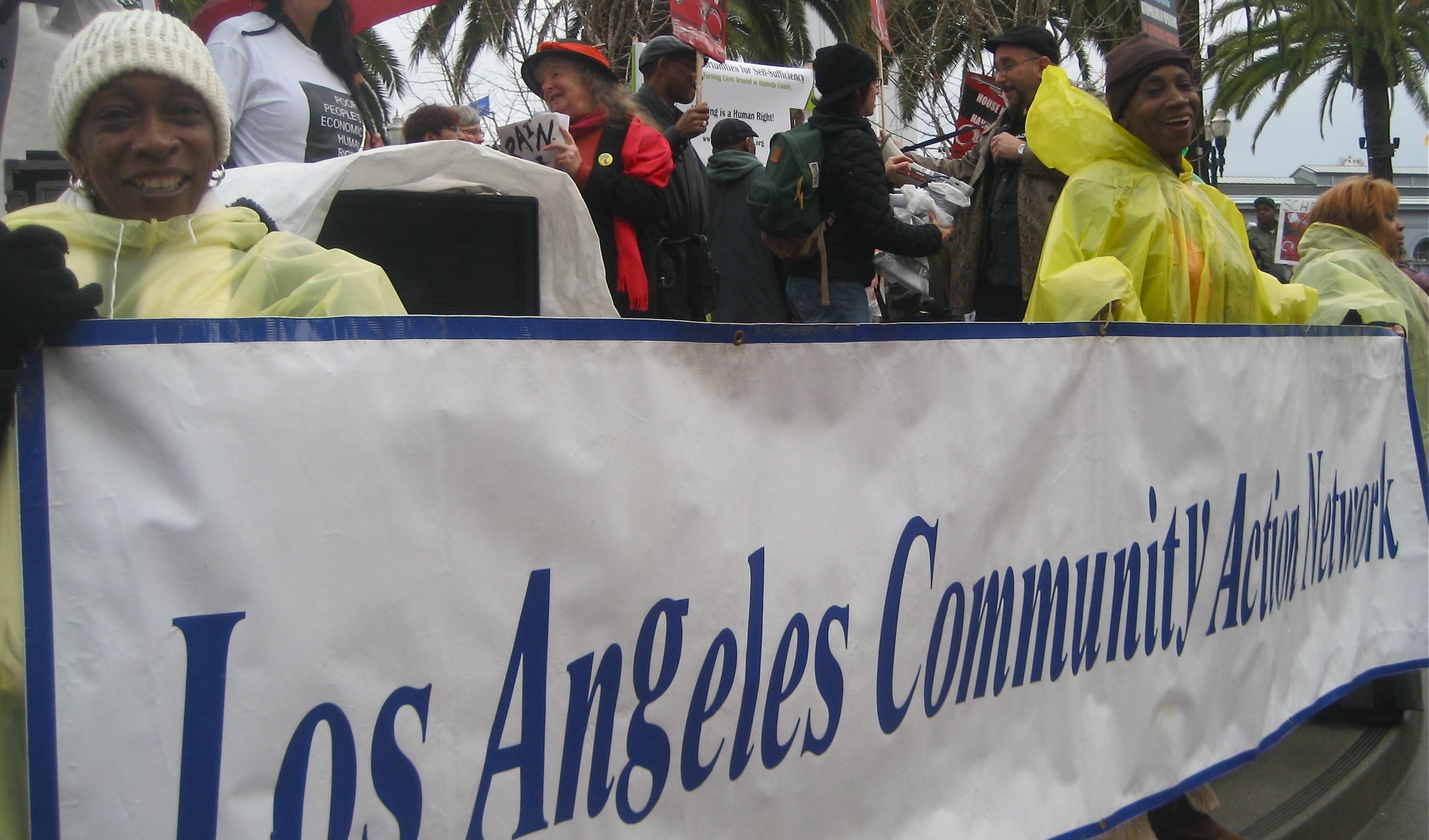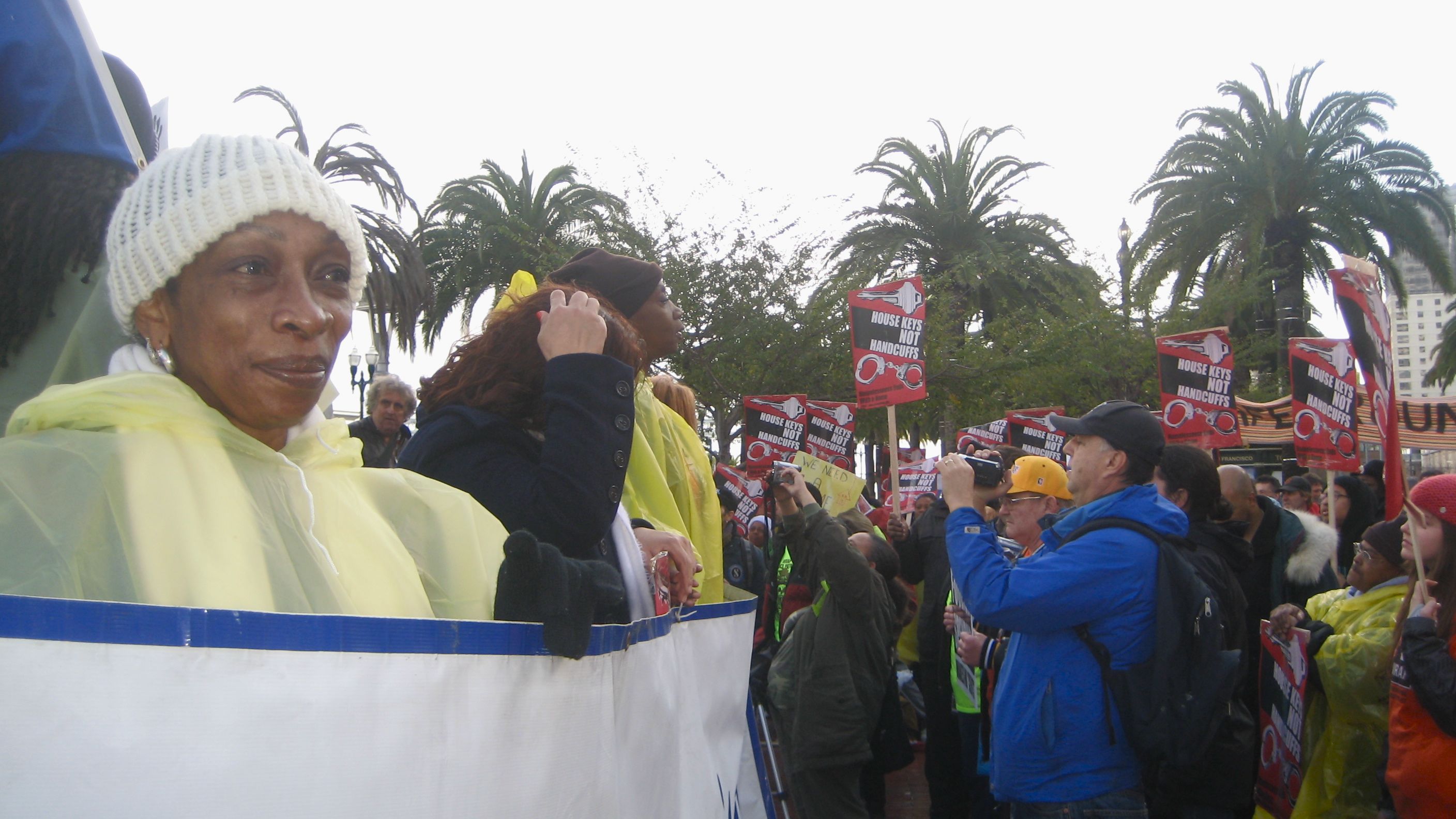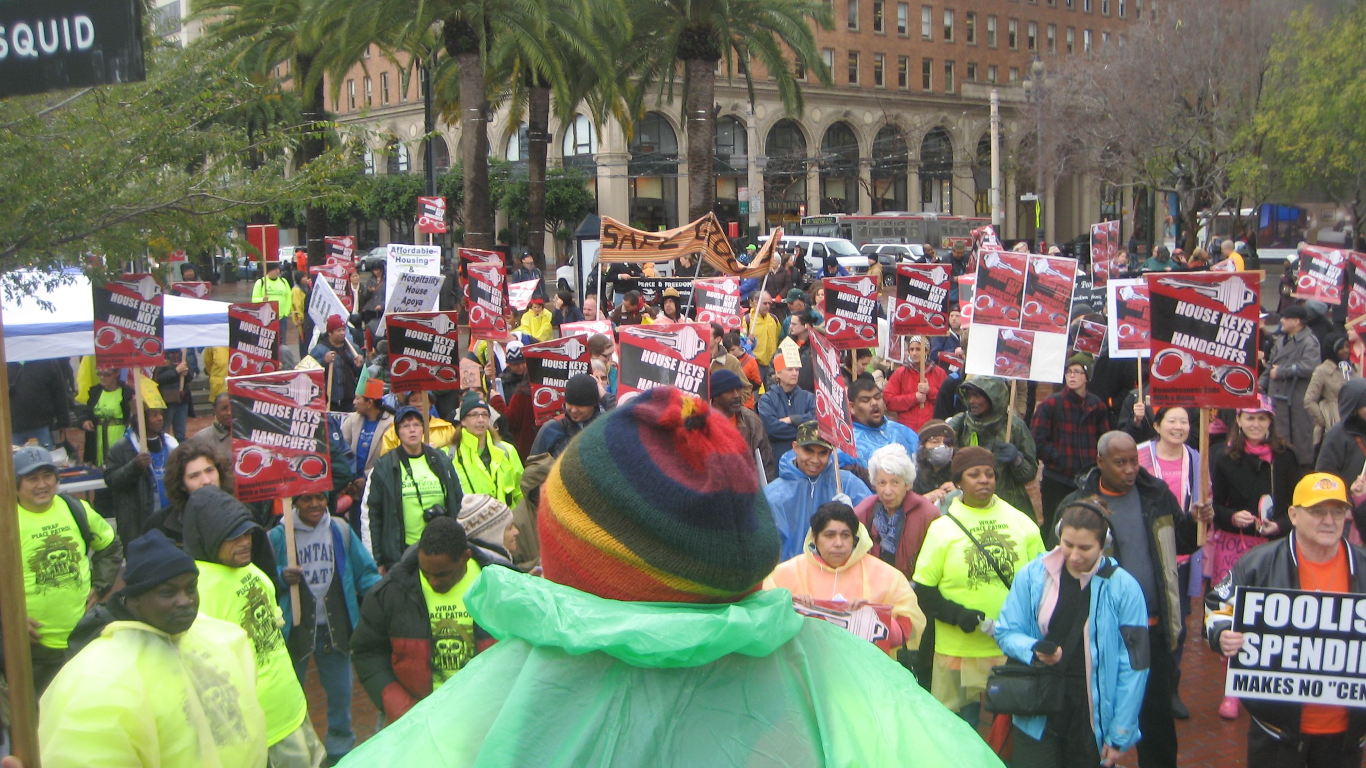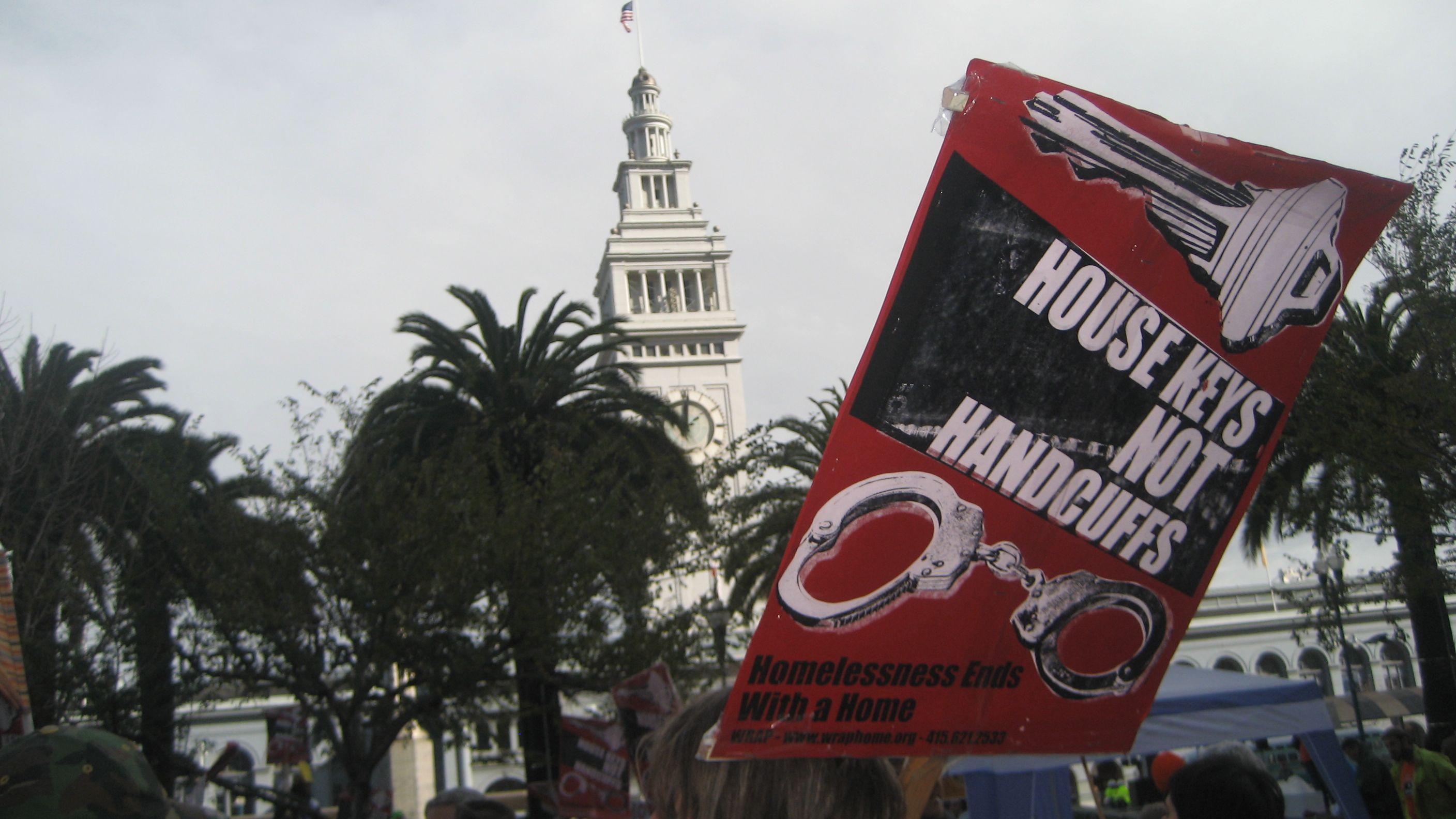 The San Francisco Coalition on Homelessness and the Los Angeles Community Action Network were well represented at the rally where hundreds filled the large plaza across from San Francisco's towering Ferry Building . Groups with colorful names such as Sisters Of The Road and Street Spirit also joined the organizing team. The Raging Grannies sang a song calling for funds for housing to the tune of "Let a Smile Be Your Umbrella", and carried parasols with painted slogans.
