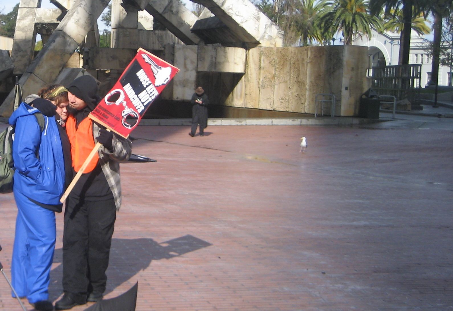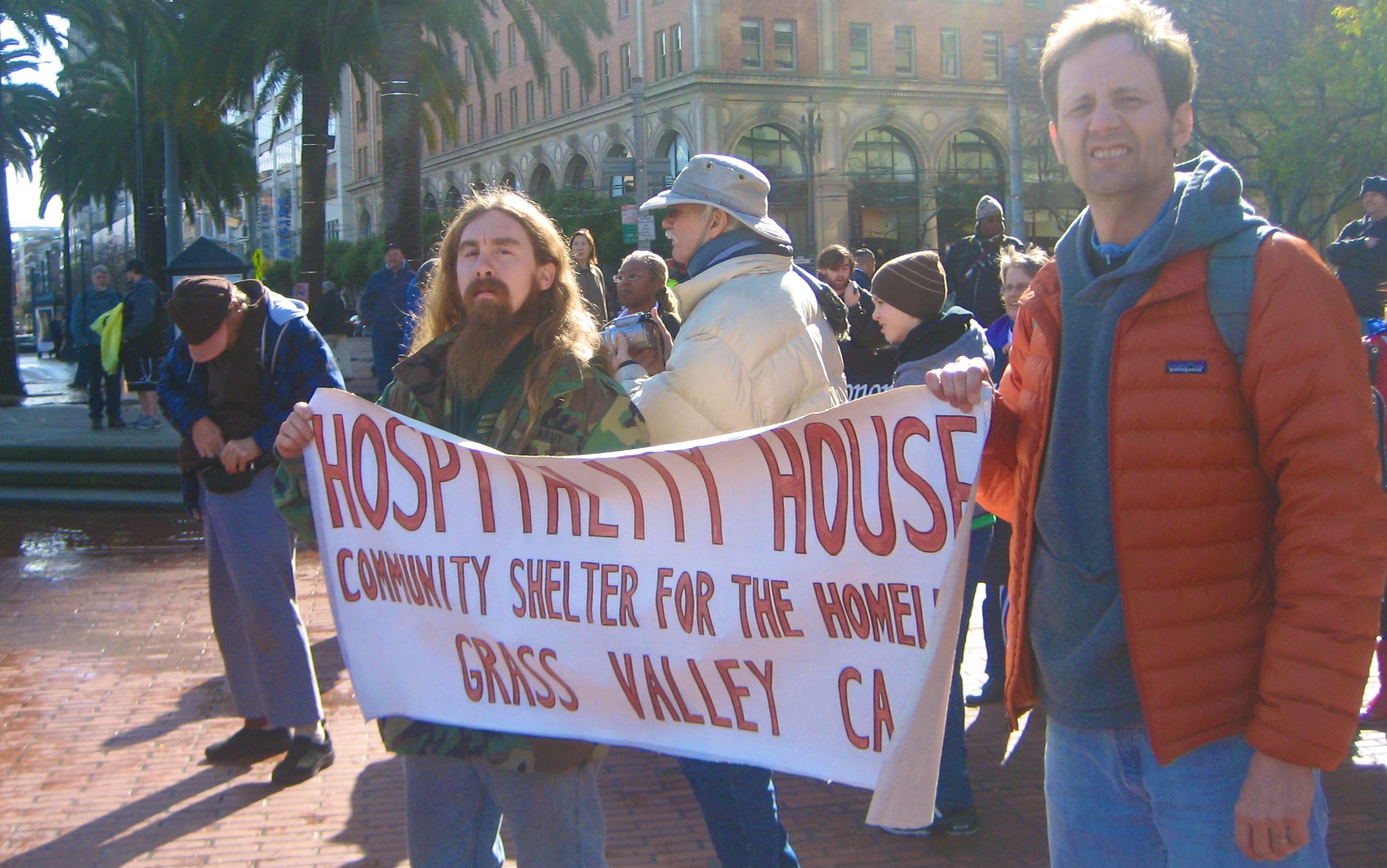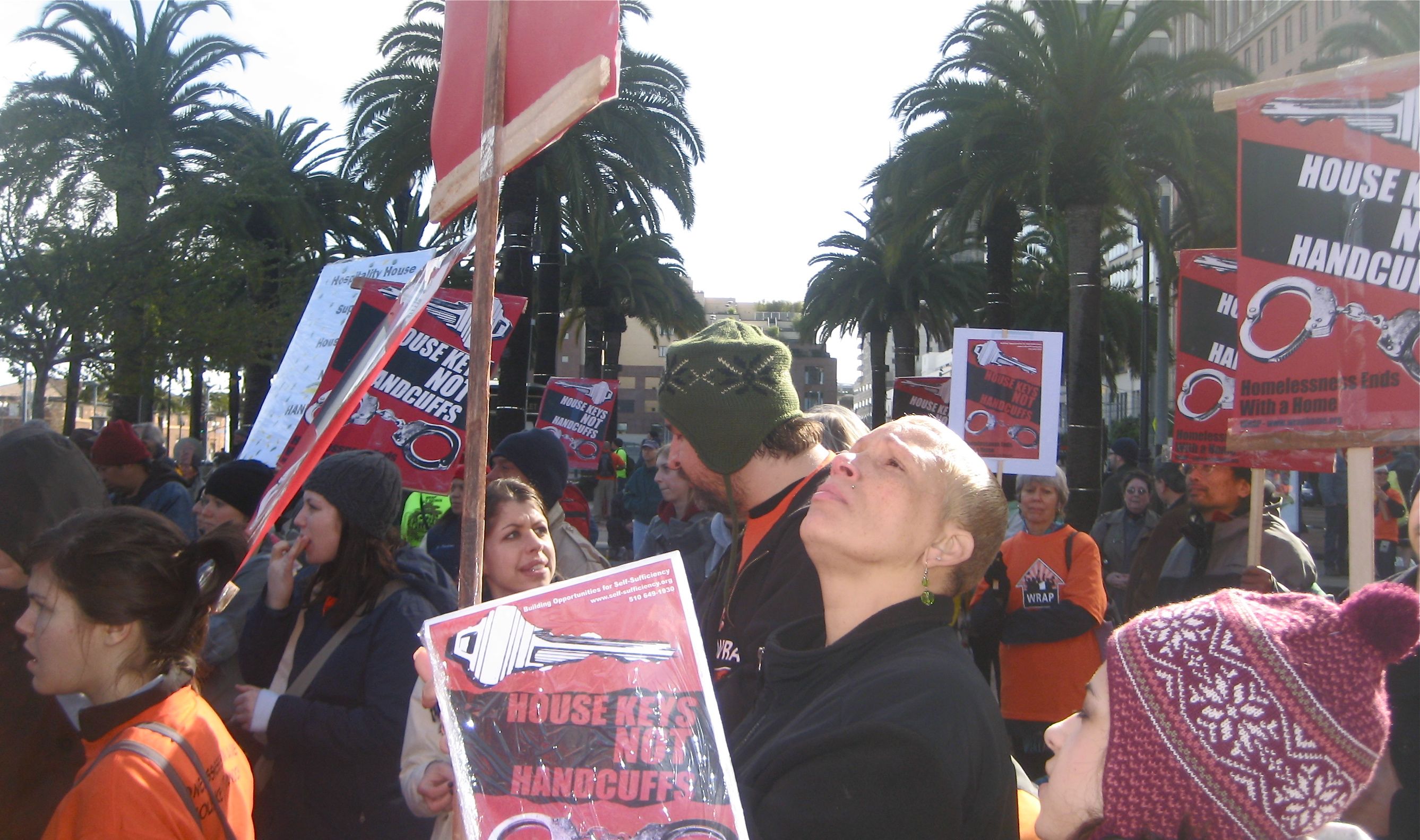 The San Francisco Coalition on Homelessness and the Los Angeles Community Action Network were well represented at the rally where hundreds filled the large plaza across from San Francisco's towering Ferry Building . Groups with colorful names such as Sisters Of The Road and Street Spirit also joined the organizing team. The Raging Grannies sang a song calling for funds for housing to the tune of "Let a Smile Be Your Umbrella", and carried parasols with painted slogans.
