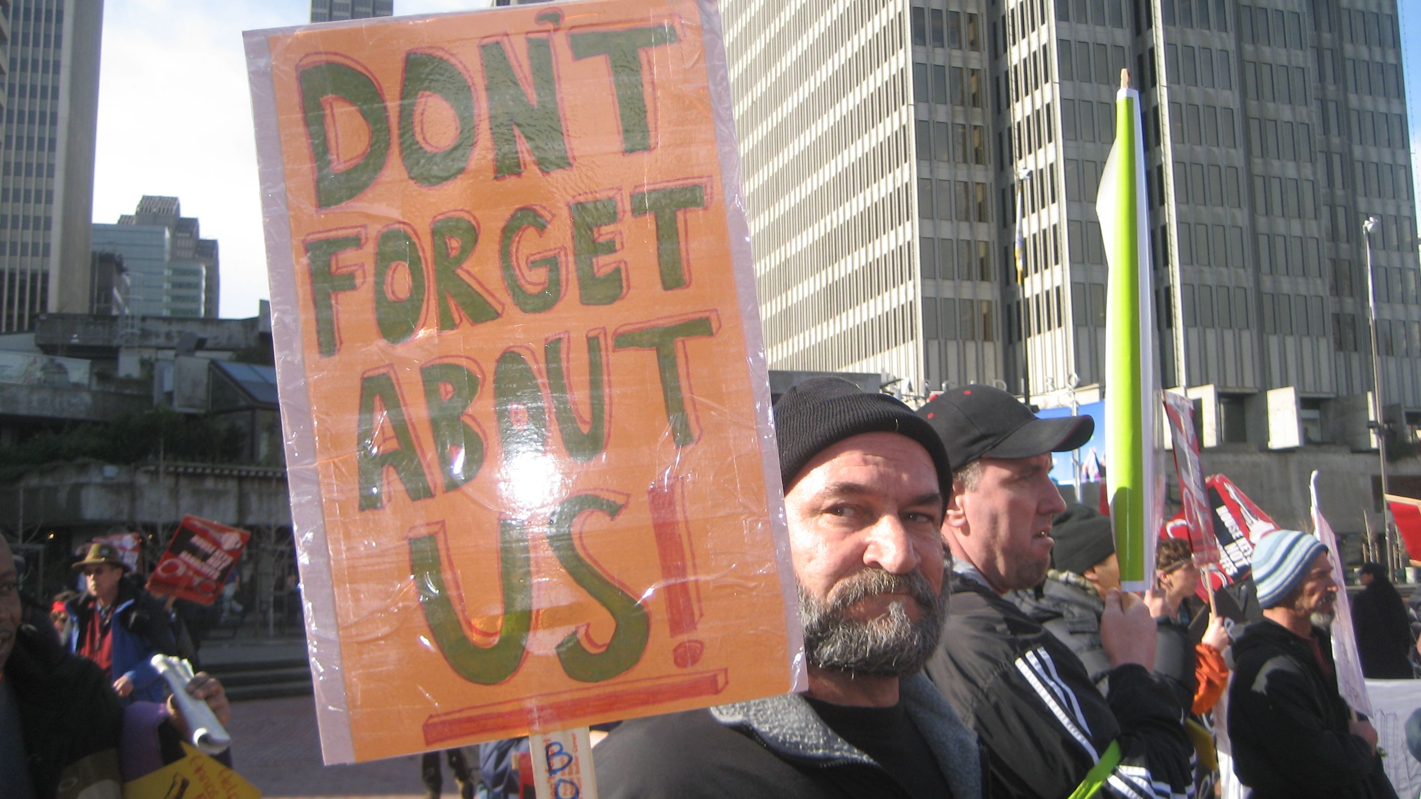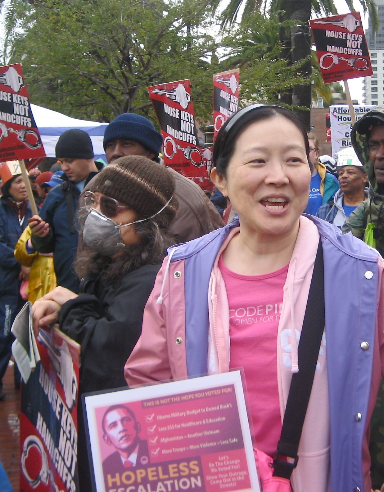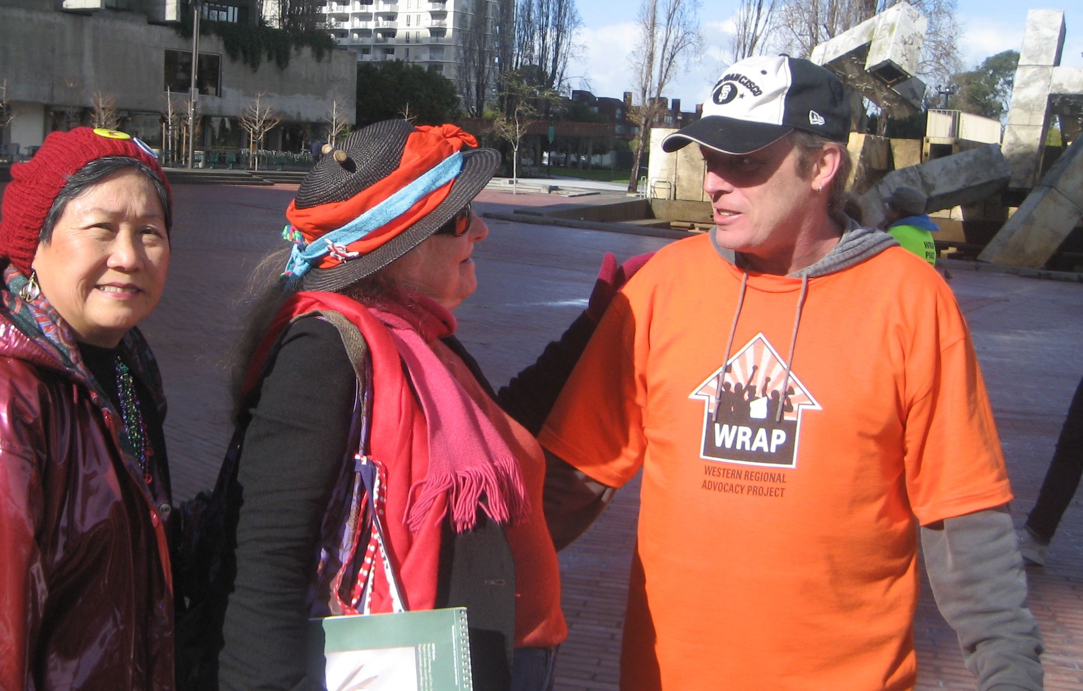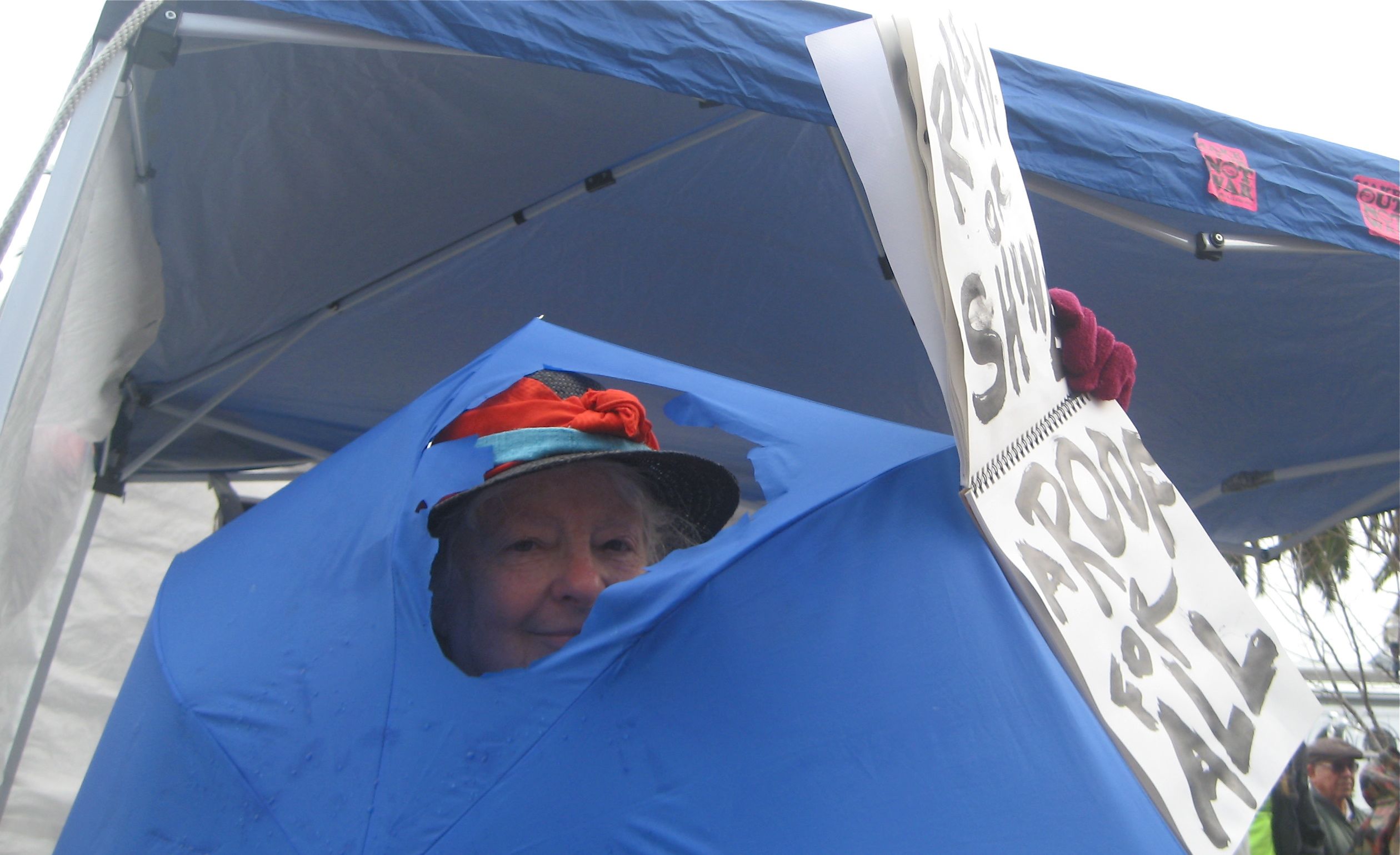 The San Francisco Coalition on Homelessness and the Los Angeles Community Action Network were well represented at the rally where hundreds filled the large plaza across from San Francisco's towering Ferry Building . Groups with colorful names such as Sisters Of The Road and Street Spirit also joined the organizing team. The Raging Grannies sang a song calling for funds for housing to the tune of "Let a Smile Be Your Umbrella", and carried parasols with painted slogans.