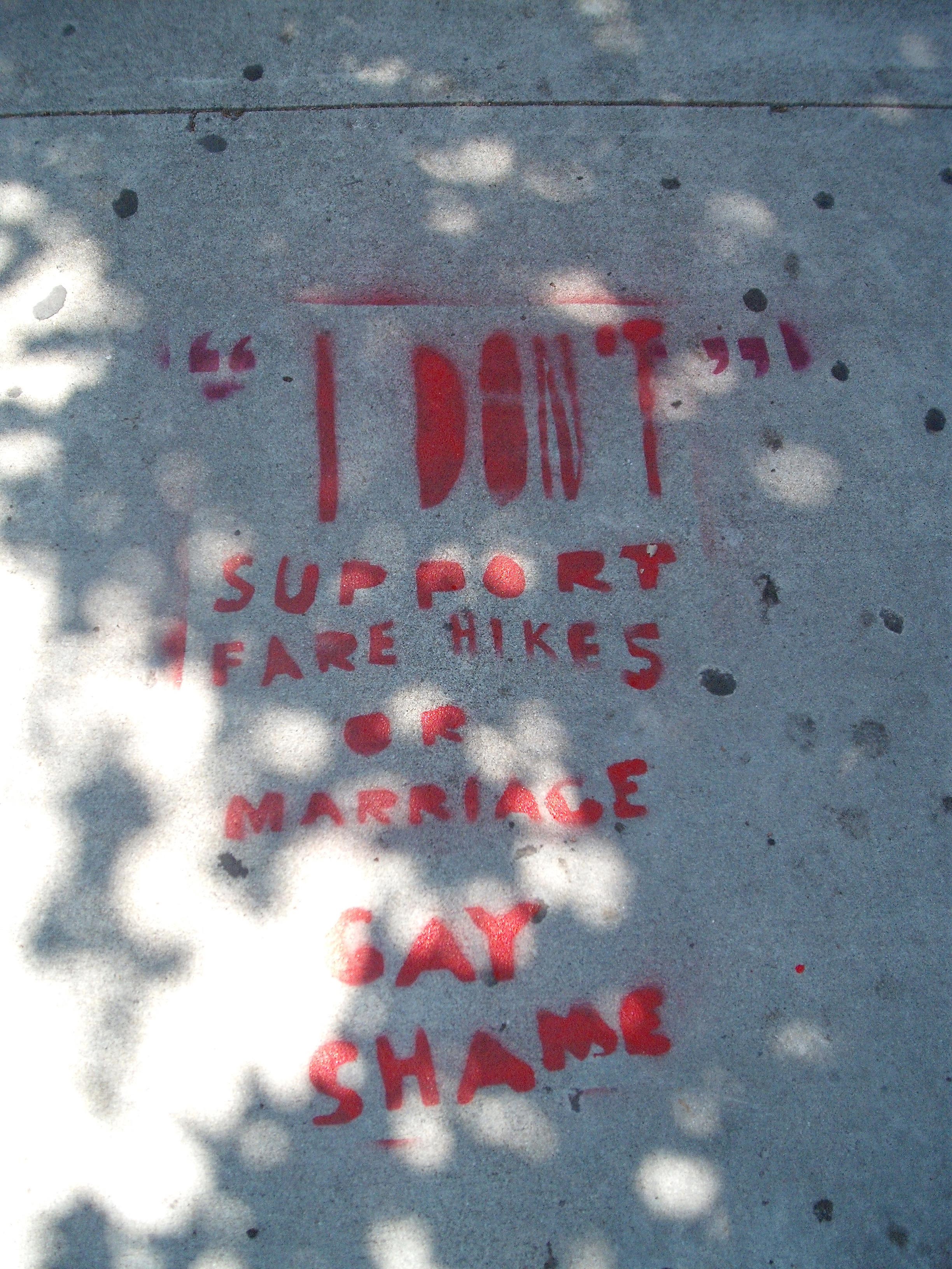 GAY SHAME is a Virus in the System. We are committed to a queer extravaganza that brings direct action to astounding levels of theatricality. We will not be satisfied with a commercialized gay identity that denies the intrinsic links between queer struggle and challenging power. We seek nothing less than a new queer activism that foregrounds race, class, gender and sexuality, to counter the self-serving “values” of gay consumerism and the increasingly hypocritical left. We are dedicated to fighting the rabid assimilationist monster with a devastating mobilization of queer brilliance.