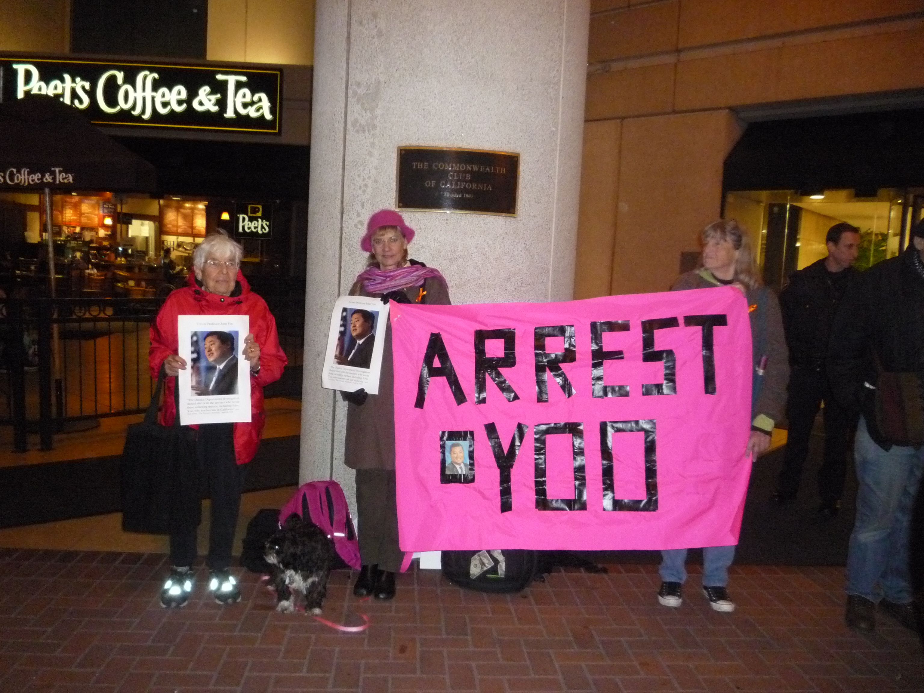 Yoo protest at the SF Commonwealth Club by CODEPINK, World Can't Wait, others to call for Yoo's prosecution for complicity in torture.