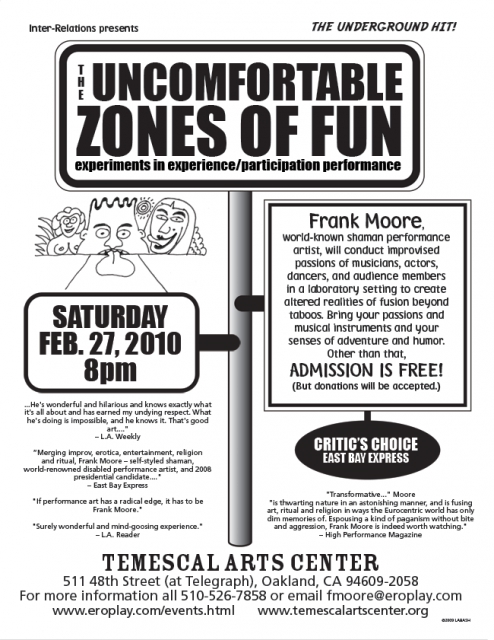 “Merging improv, erotica, entertainment, religion and ritual, Frank Moore – self-styled shaman, world-renowned disabled performance artist, and 2008 presidential candidate ...." – East Bay Express
