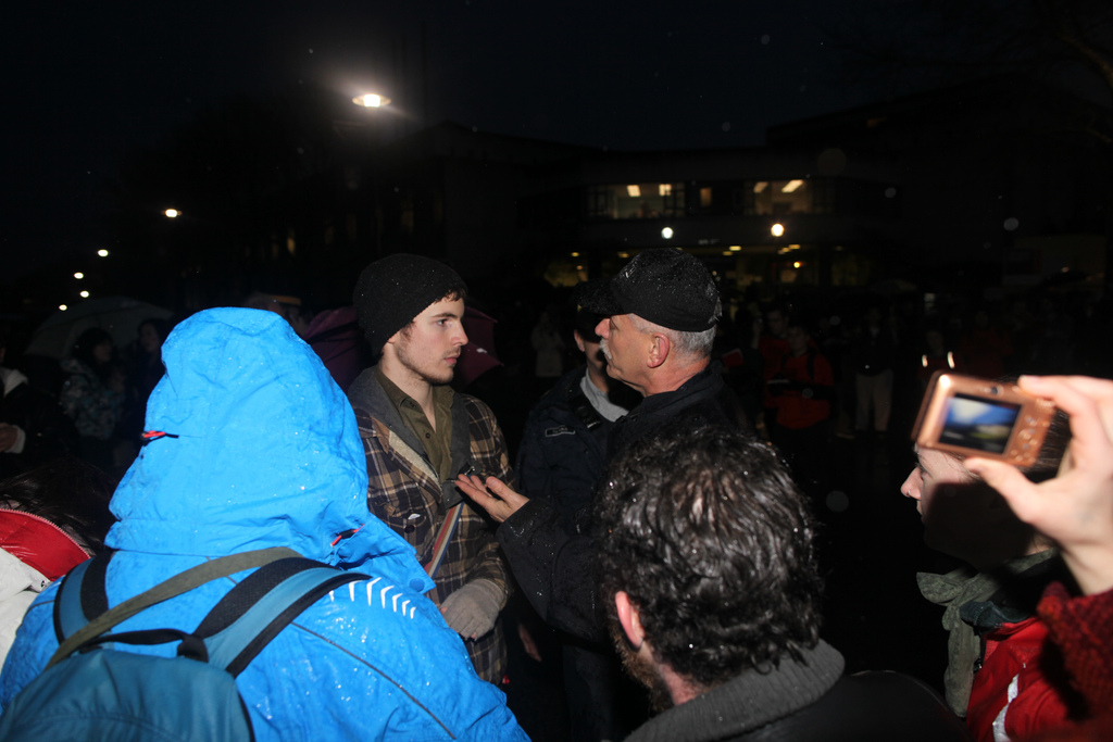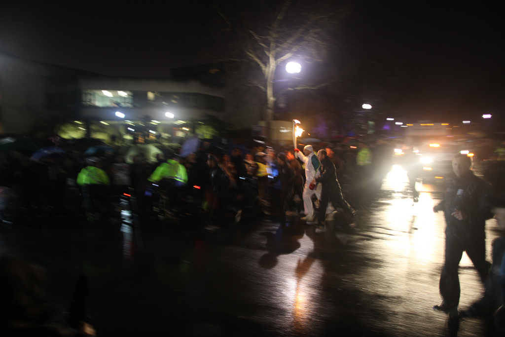 Earlier tonight, we went to document what was supposed to be a "guaranteed" disruption by student activists of the Olympic torch as it made its way through the University of British Columbia campus toward downtown Vancouver. About 100 people chanting slogans like "Home Not Games" and "Get the Torch Off Our Campus" marched around in the chilly rain, finally stopping to block an intersection on the torch's route. A handful of way-too-friendly Canadian police asked people to step back to the intersection's edges, and the students--a coalition of Christian, social justice, and environmental activists, and as one student said, "perhaps some sectarian folks"--complied way-too-readily. A police van with a ticker-tape-like moving message came toward the intersection, announcing the flame's approach and then reminding all the protesters to "have a really great day." We leaned forward with our camera, absently pushing past one of the relatively few police who were barely holding people in check, as the flame came toward the chanting crowd and then turned the corner. So few cops, and all trying to be so low key to keep a "family face" on the Olympic festivities here, and relatively so many more students and onlookers. It would have been so easy to disrupt the runner. Yet the Olympic torch passed without incident--a sadly deflating moment, given that the flame has been challenged, detoured, and/or stopped across Canada these past few months.