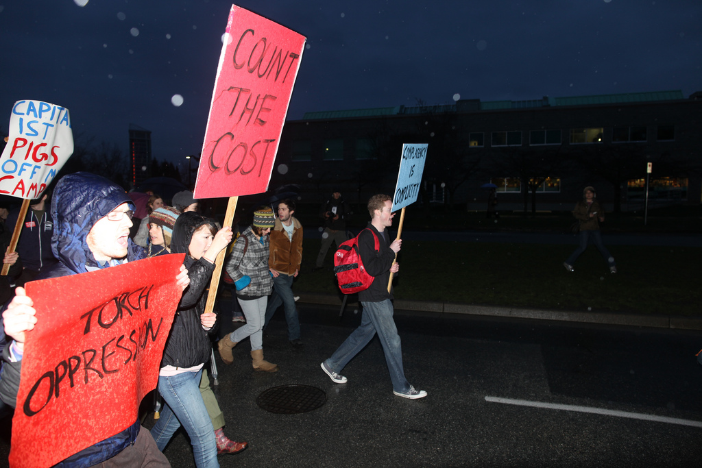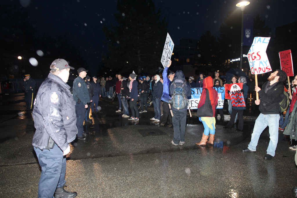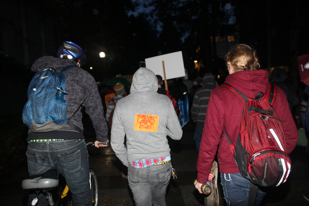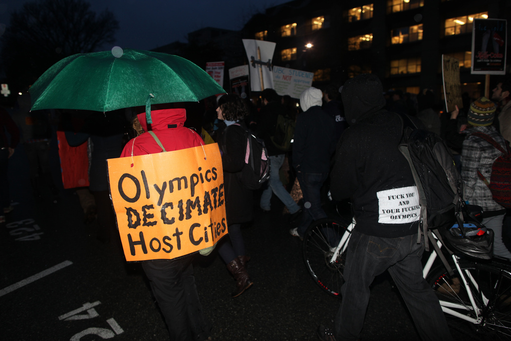 One student at this protest mentioned that activism on campus was difficult; people were ignorant, and the frats and sports-minded students were glad for the Olympics. The many thousands of students down the road from us, wrapped in Canadian flags and listening to the national anthem, some mocking the protesters, testified to how hard it must be. At the same time, the university had agreed to build a facility for the Olympics that, in turn, has resulted in a fee increase for students, particularly international students and students of color. The student who explained this to me also mentioned that the university's governing body was made up of the same type of people who benefited by the property development that comes in the wake of the Olympics. In earnest, this student insisted that as the economic crisis grows, people will start to respond.