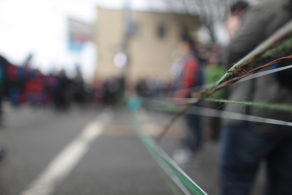 And they did. A good-size contingent of black bloc anarchists and peace activists, climate justice folks and indigenous radicals, people on bikes and in wheelchairs, queer activists and kids in strollers, a marching band and teenagers released from school because of the Olympics, an assortment of neighborhood activists and non-black bloc anarchists, and many others kept up a rowdy and militant presence in the streets. The torch was diverted, and diverted again, and diverted yet again, each time by the diverse contingent holding intersections together. At the first intersection, for example, people ran string and barbed wire between light posts, across the entire street, fortified by rocks on the ground, while the chants ranged from "homes not games" to "no justice, no peace, fuck the police."