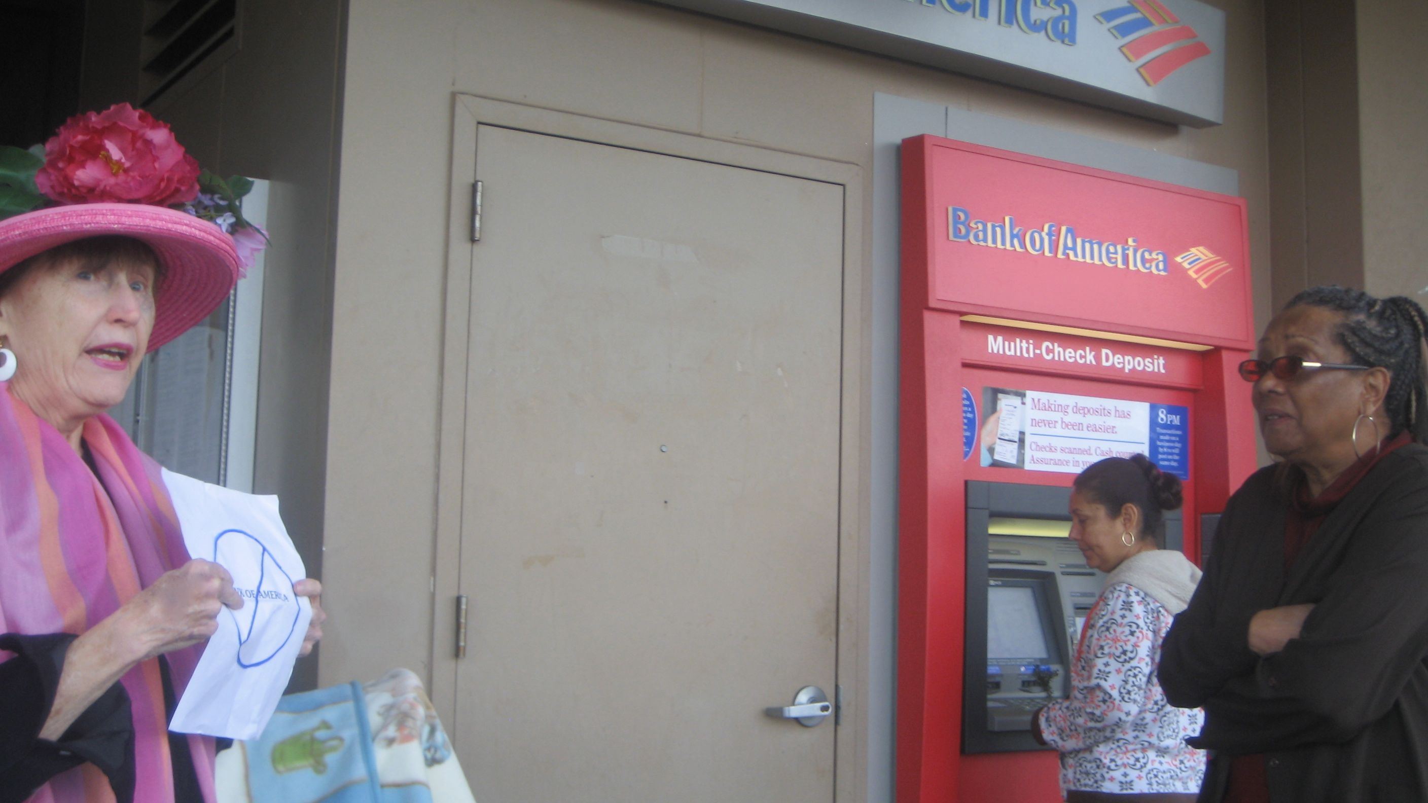 Say goodbye, adios, and sayonara to Big Banks! This week the Raging Grannies of the San Francisco Bay area are spreading the word that big banks are bad for America, and bad for your life. The Grannies passed out fliers at an SF peninsula ATM, sang some anti-big-bank songs and had some interesting conversations.