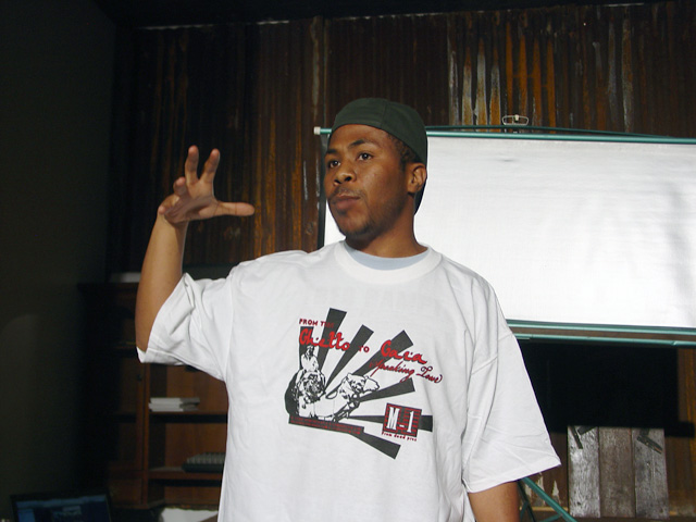 Duane Adee Deterville of the Black Dot Cafe opens the benefit by discussing the rich history of West Oakland and efforts to retain the cultural vitality of the neighborhood.