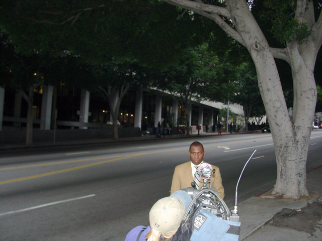 At Johannes Mehserle's second pre-trial hearing in Los Angeles, the LA Coalition for Justice for Oscar Grant again demonstrated against racist police violence in front of the Los Angeles Superior Courthouse. Mehserle himself was rushed into and out of an underground parking garage in a black SUV with dark-tinted windows. Inside the court room, both of Mehserle's defense motions -- to reduce bail and to remove the Alameda DA's office from the case -- were denied by Judge Perry. After the hearing, family lawyer John Burris answered questions from the corporate media.