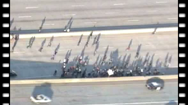 Near 1:50 in the video, it is very fast. You can't quite see the positions of police officers on the freeway, or how many people are on the far side of the tree. The people the camera is focusing on all lay down pretty quickly as though they are being ordered. I can only see the motorcycle officer, but it seems like there are officers on food additional to this, who are giving the orders.