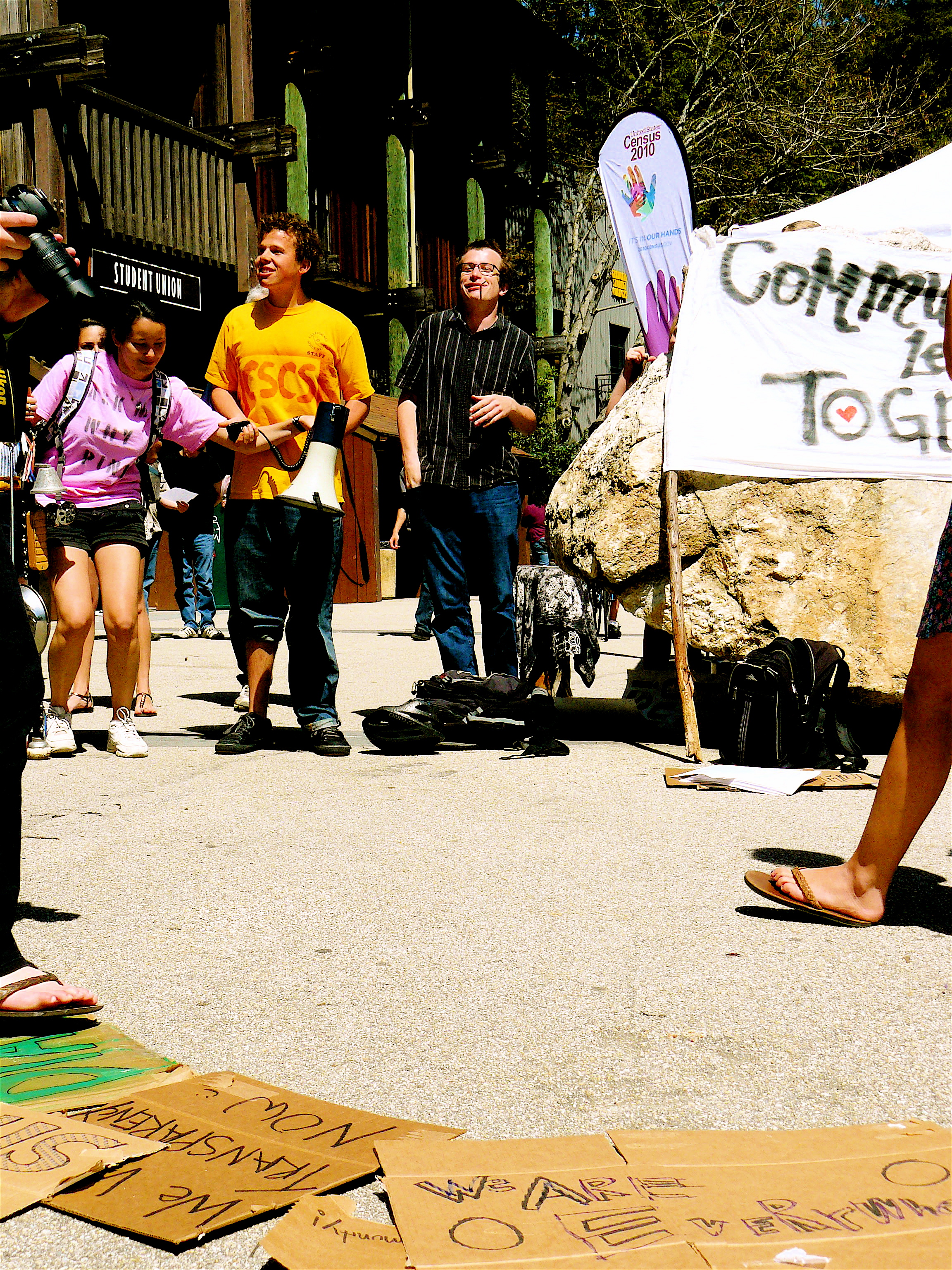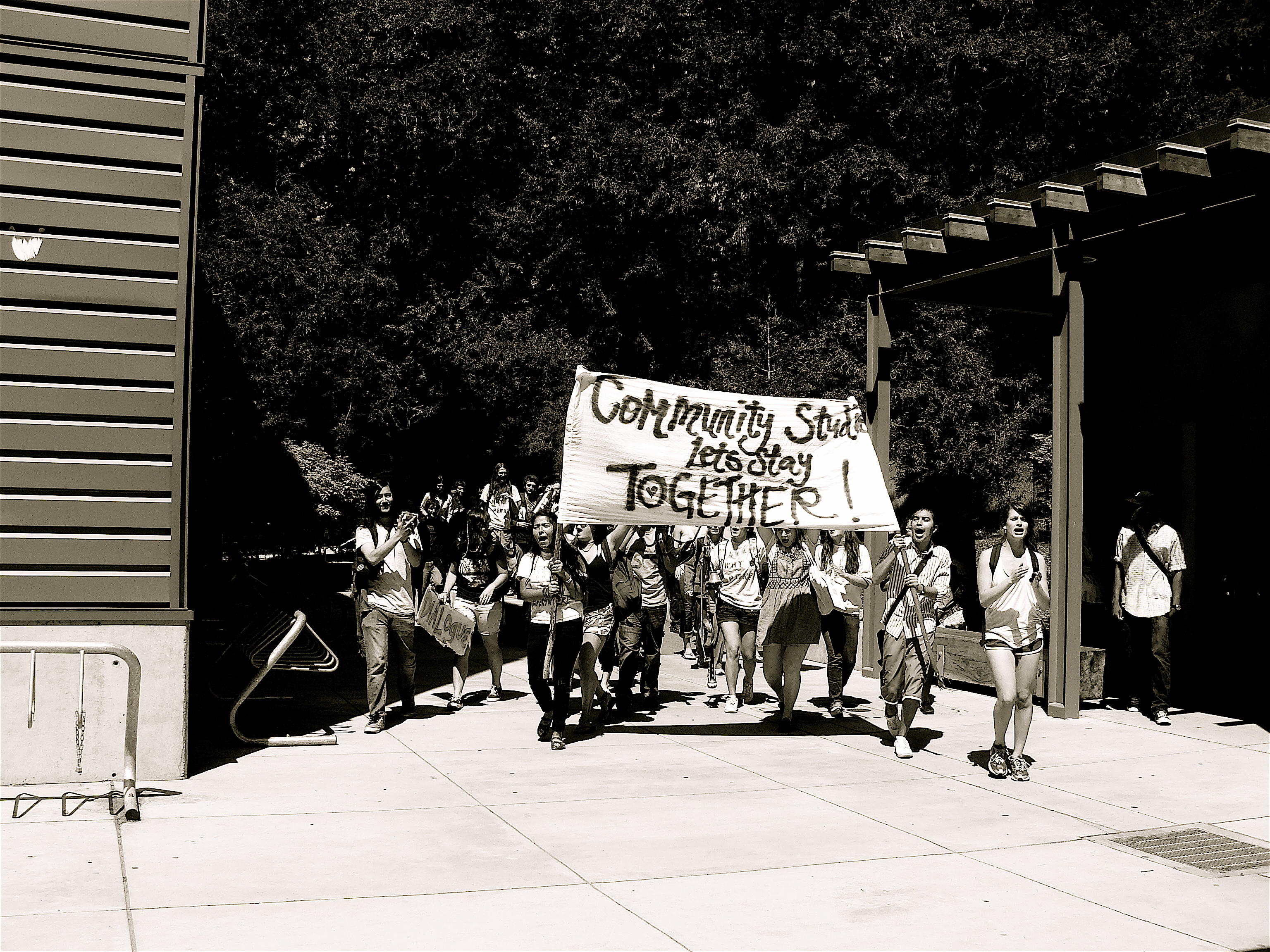 On April 7, 2010 an email was sent out by Allison Galloway who announced that Dean Kamieniecki has decided to suspend the Community Studies major. In response to this announcement, UCSC Community students and a variety of students from different departments got together and marched around campus to protest this atrocious decision. Apparently social change is not profitable according to UCSC 'priorities'. This decision many CMMU Faculty feel alienated and silenced throughout this administrative process.