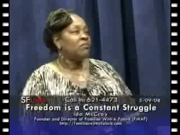 Our guest is Ida McCray, Founder and Director of Families With A Future (FWAF). A former political prisoner, mother and grandmother, Ida formed this network in recognition of the pain of separation children and incarcerated parents suffer. FWAF provides support and transportation to facilitate family visits, and works with women released from prison to help them re-enter their communities.