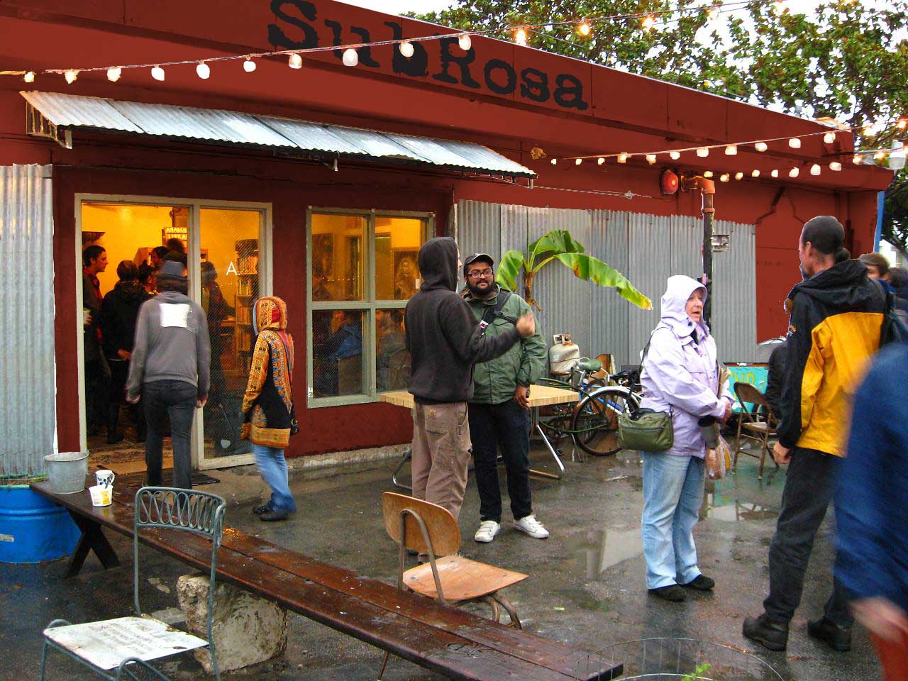 About SubRosa: SubRosa is a non-profit, donation-funded space in downtown Santa Cruz for art and radical projects run by a collective of volunteers from the local anarchist community. It offers anarchist books and literature, gourmet coffee, performance and a weekly open mic, gallery art by emerging local artists, and a garden courtyard social space.