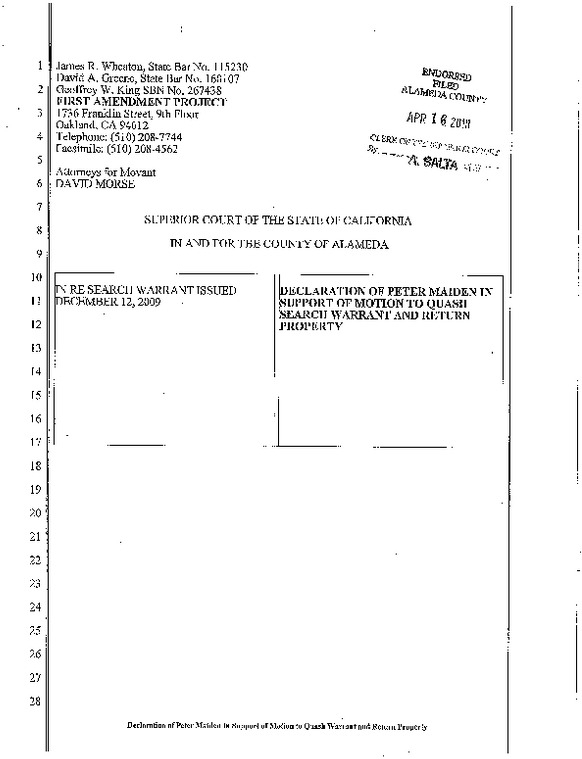 Contact: David Greene, Geoffrey King, First Amendment Project 510.208.7744