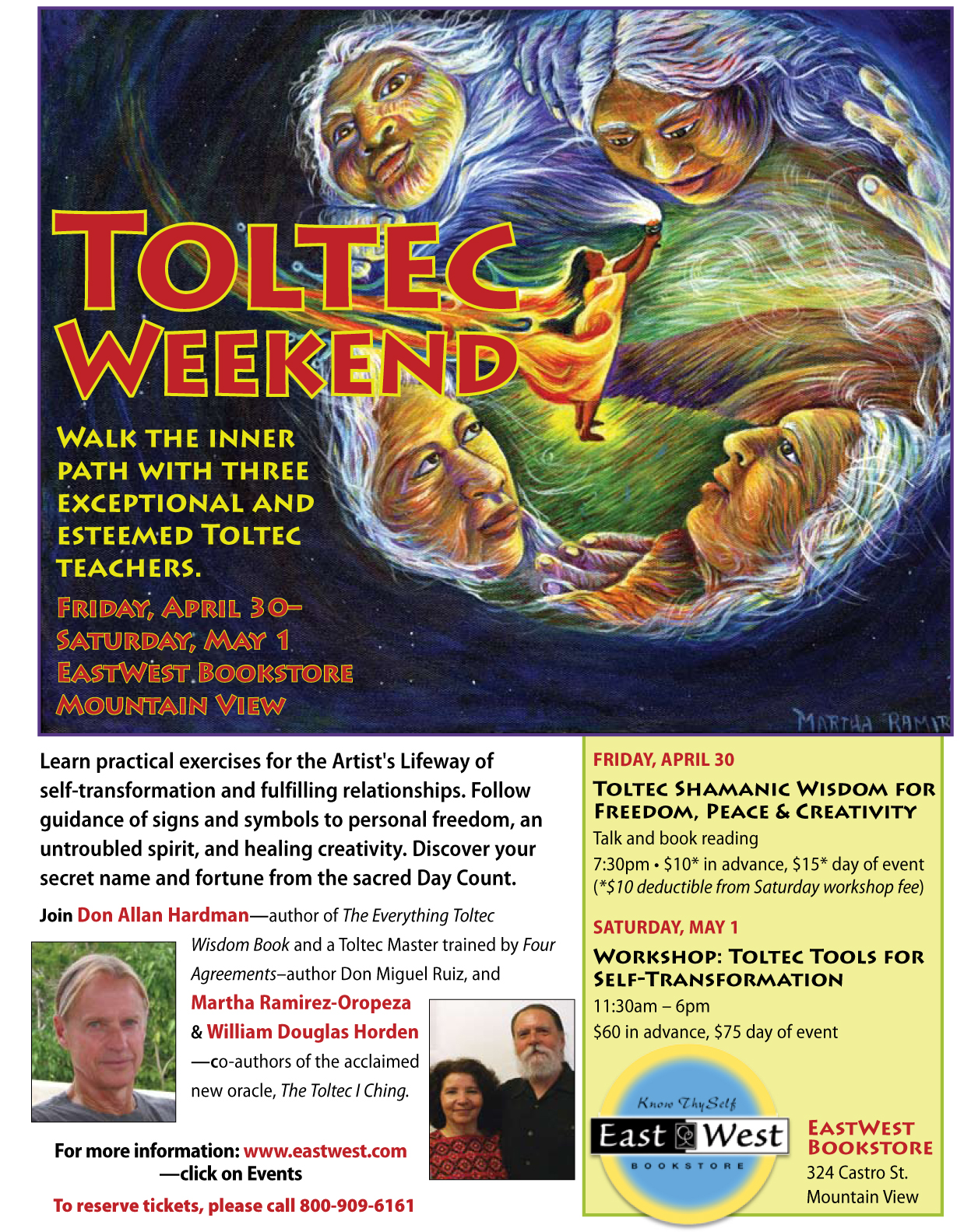 Authors and Toltec leaders Don Allan Hardman, author of The Everything Toltec Book, and Toltec Master trained by Four Agreements author Don Miguel Ruiz, Martha Ramirez-Oropeza and William Douglas Horden, authors of the acclaimed The Toltec I Ching (just won Nautilus Awards Silver medal for Art/Gift book) will share practical exercises for traveling the Artist's Lifeway of