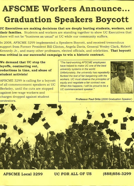 AFSCME local 3299 has announced its commencement speakers boycott at UC in a continuation of our efforts to stop layoffs and wage cuts to low-wage workers, contracting out, fee hikes and abuse of activist students.