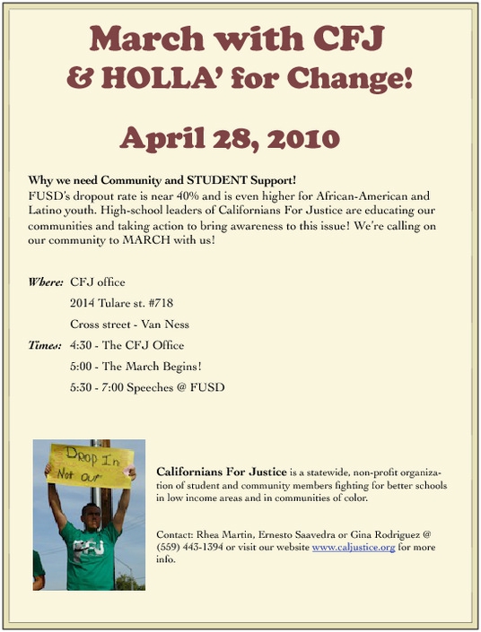 Students, parents, and community members will march, rally, and speak before and during a Fresno Unified School Board meeting to raise awareness on the high local drop out rates. This is a continuation of “Educación Sin Barrera’s/Education Without Barriers”, a campaign launched a year ago that seeks to address and reduce the high drop out rates of Fresno’s low-incomes students, immigrant students, and students of color.