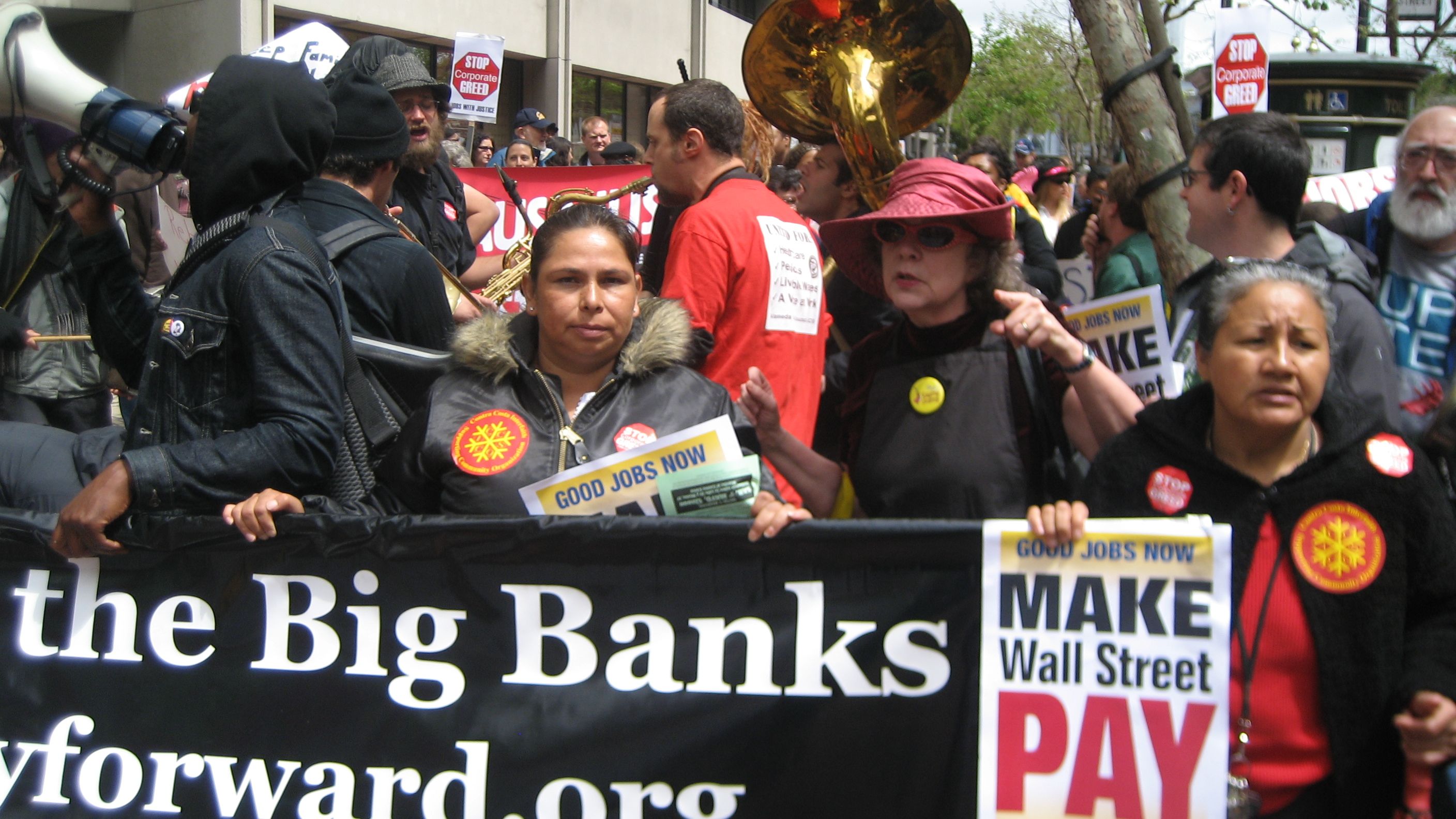 With their rallying cry "Break Up the Big Banks!" members of A New Way Forward (ANWF) joined a broad coalition of labor and community organizations to march on a Wells Fargo Shareholders meeting today.