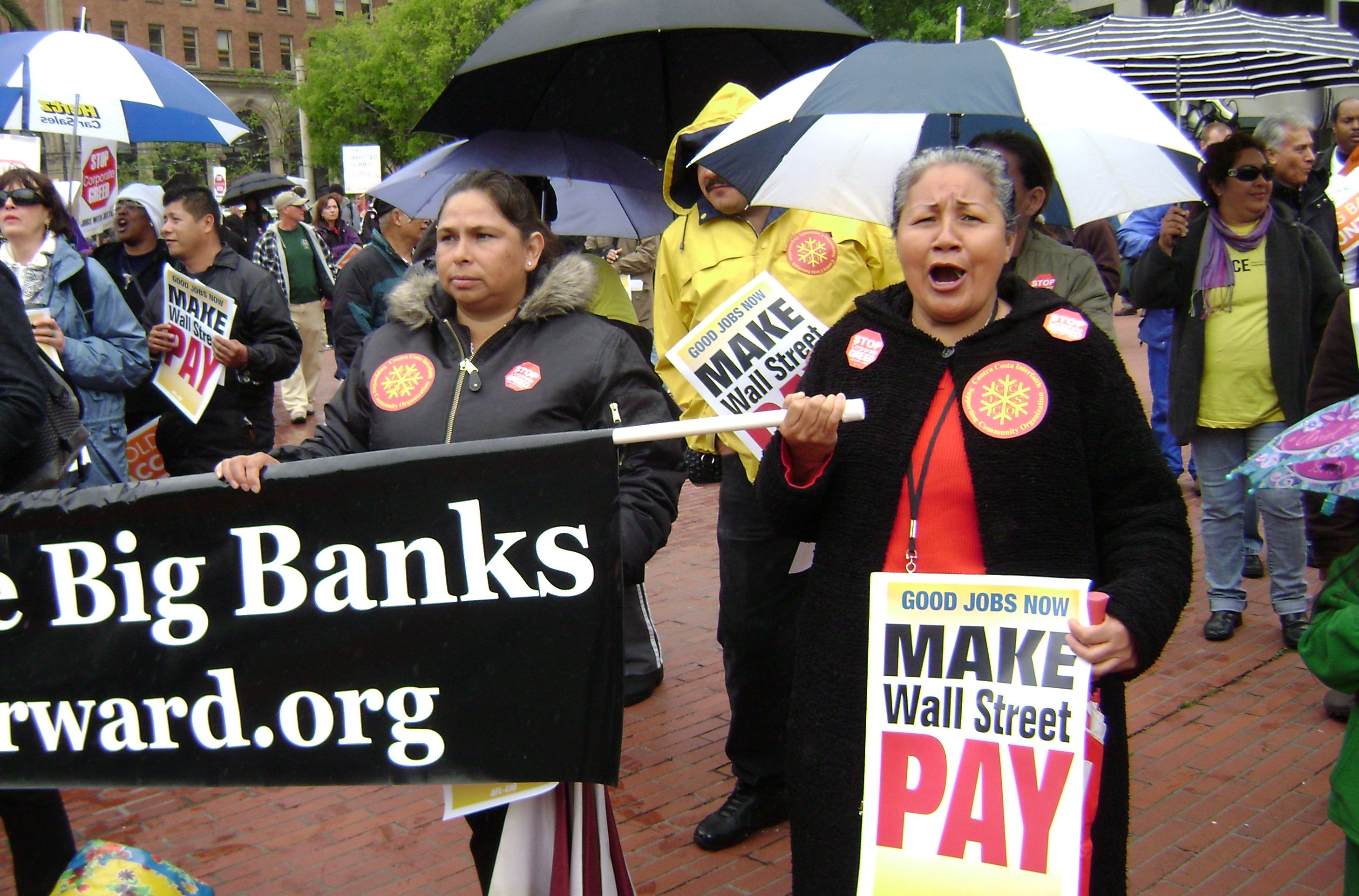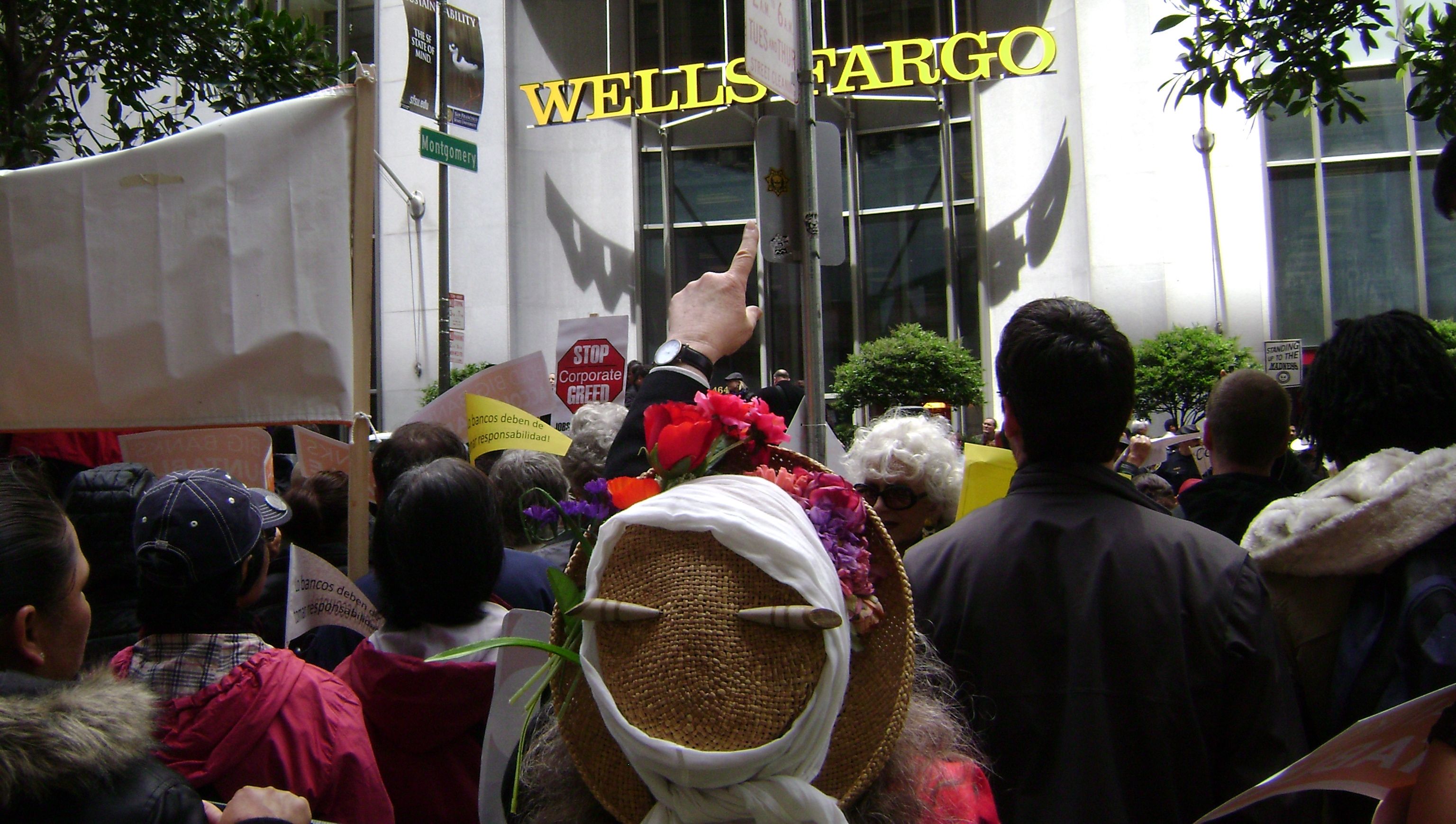 They locked arms with members of Causa Justa and took up the breadth of the sidewalk behind the ANWF banner as they made their way along California Street to reach the Wells Fargo shareholders meeting. At the site of the protest they pointed to the huge Wells Fargo building sign and led chants, including, "You got bailed out, we got sold out!"