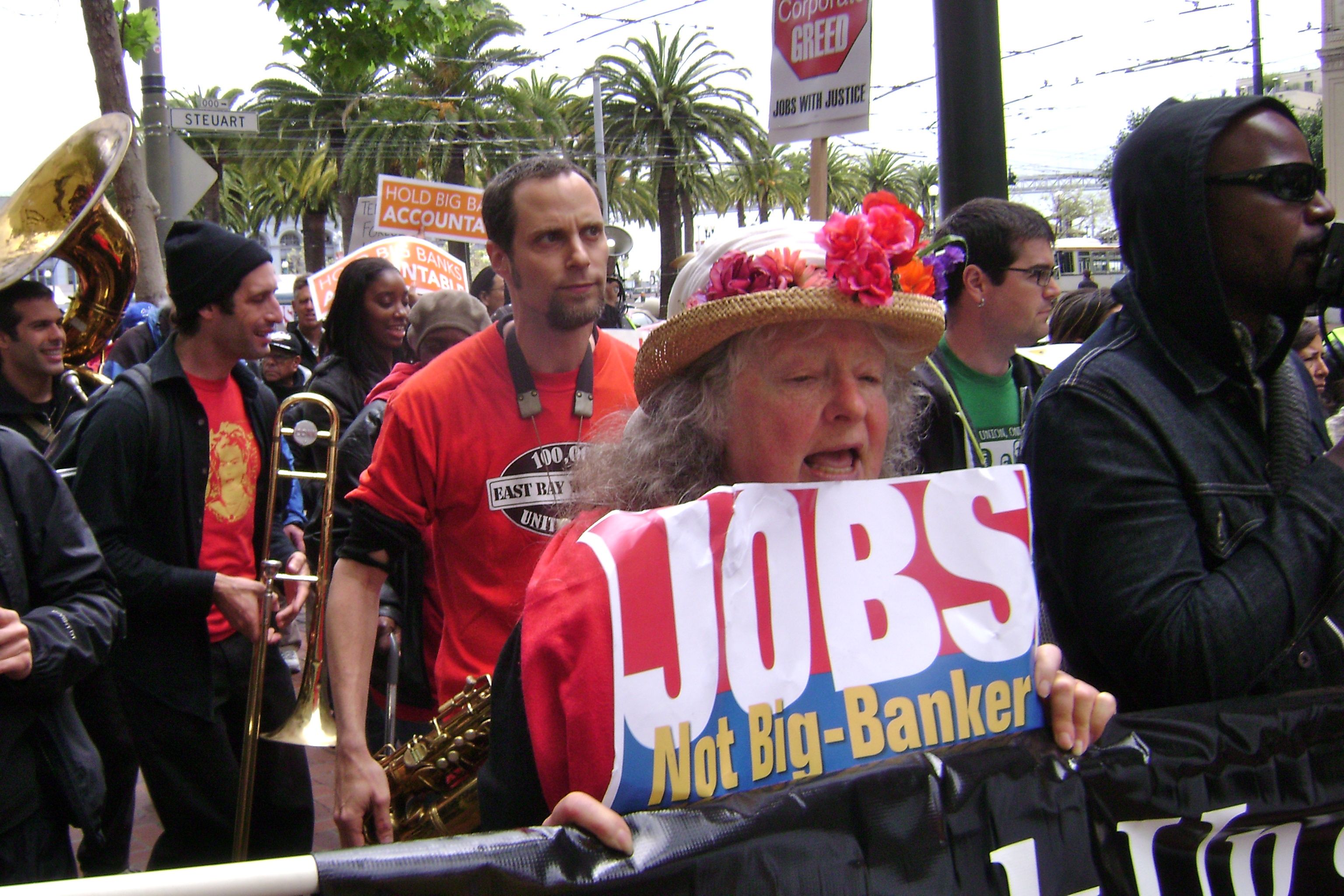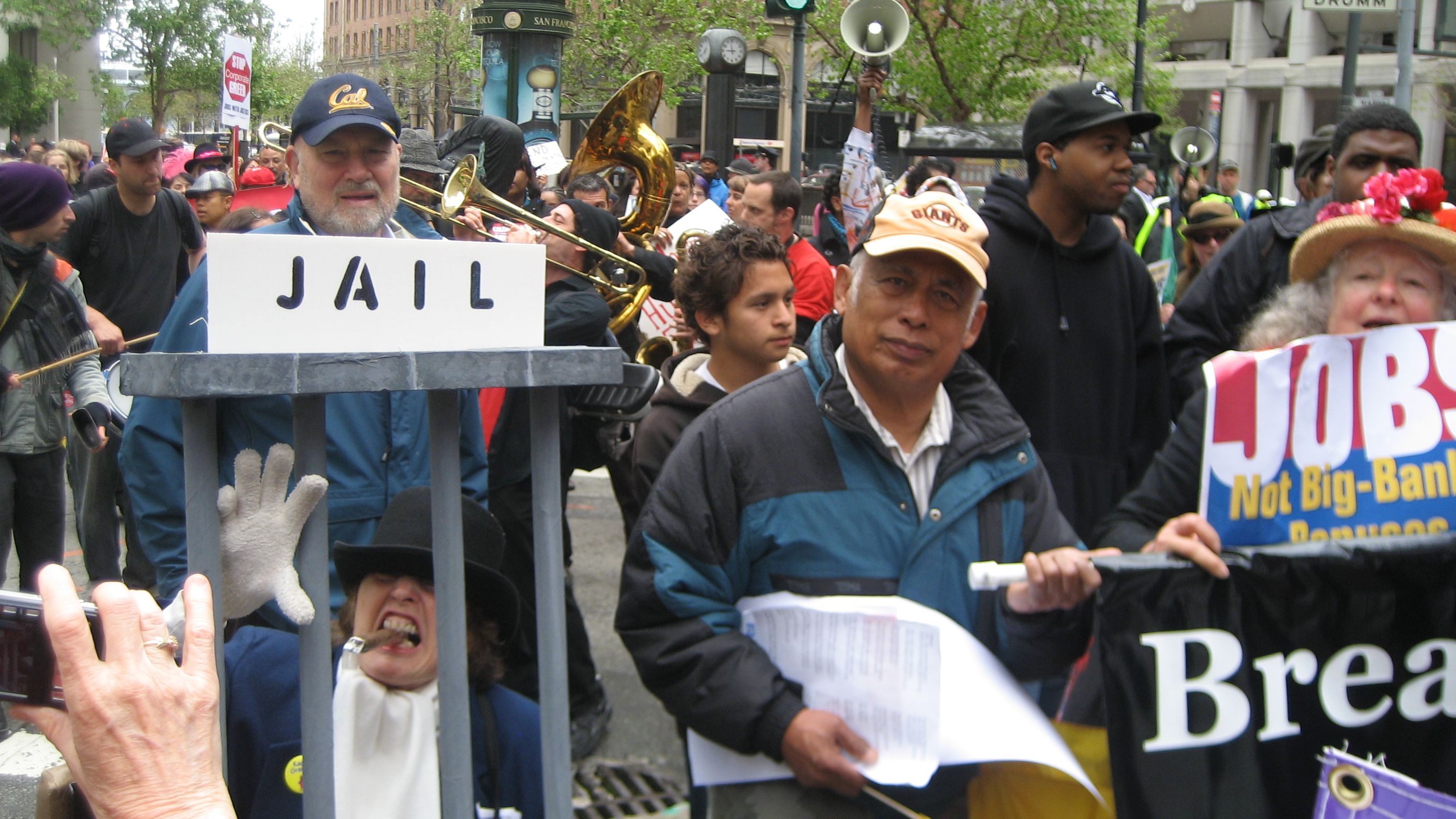 ANWF member and Raging Granny Gail Sredanovic portrayed a banker behind bars, delighting a crowd that shouted "Go to Jail!" Businesspeople on lunch breaks joined in the street theater as unwitting bank customers. ANWF members stood side by side with friends from Tenants Together and waved to tourists on passing cable cars, spreading the word: Break Up the Big Banks! Moratorium on Mortgages!