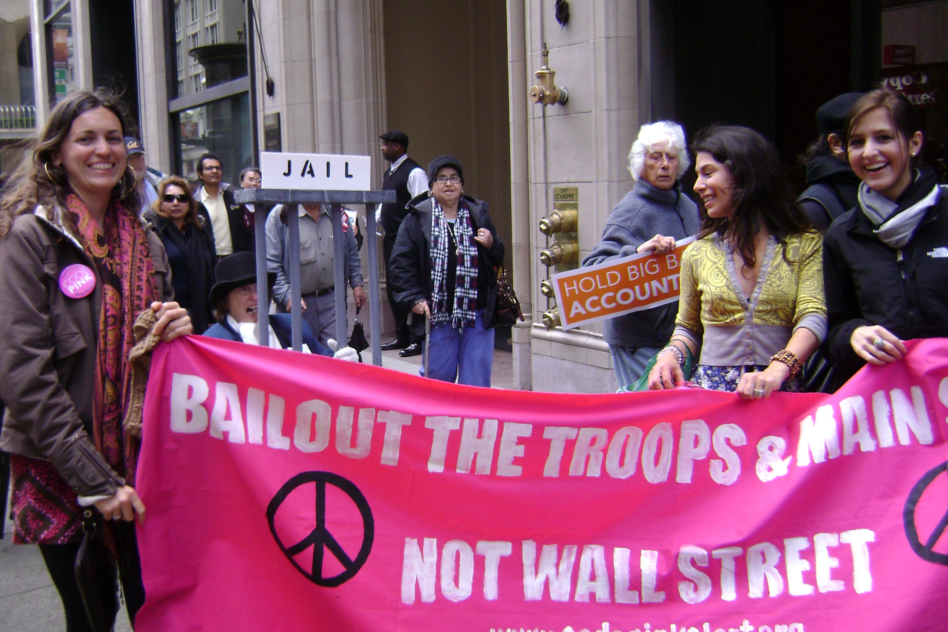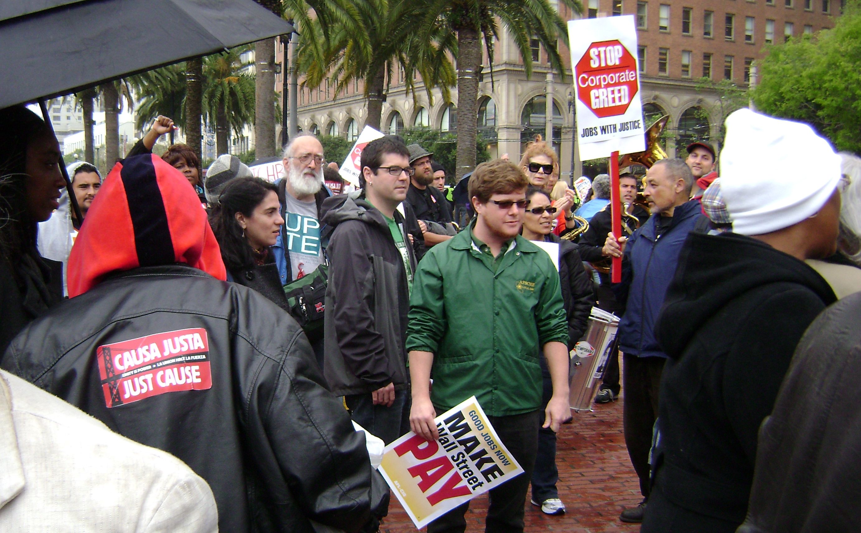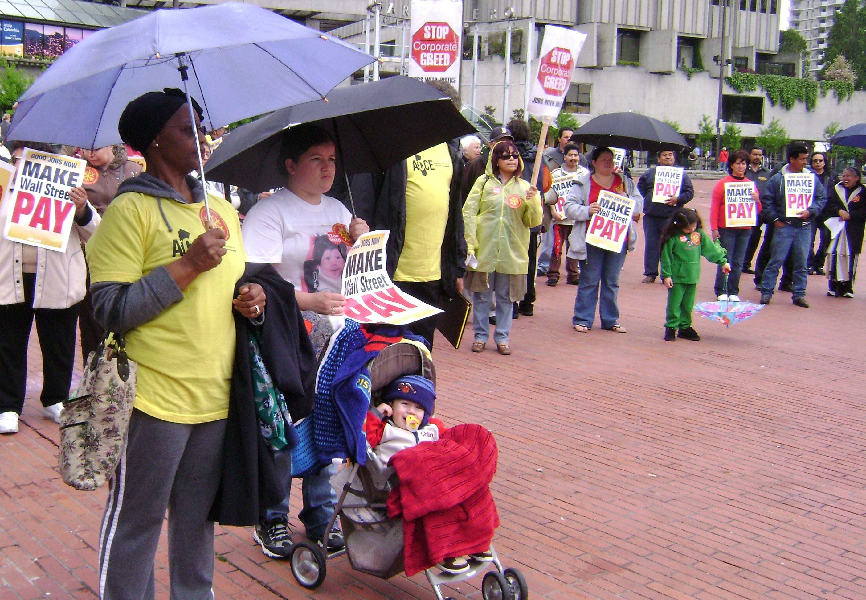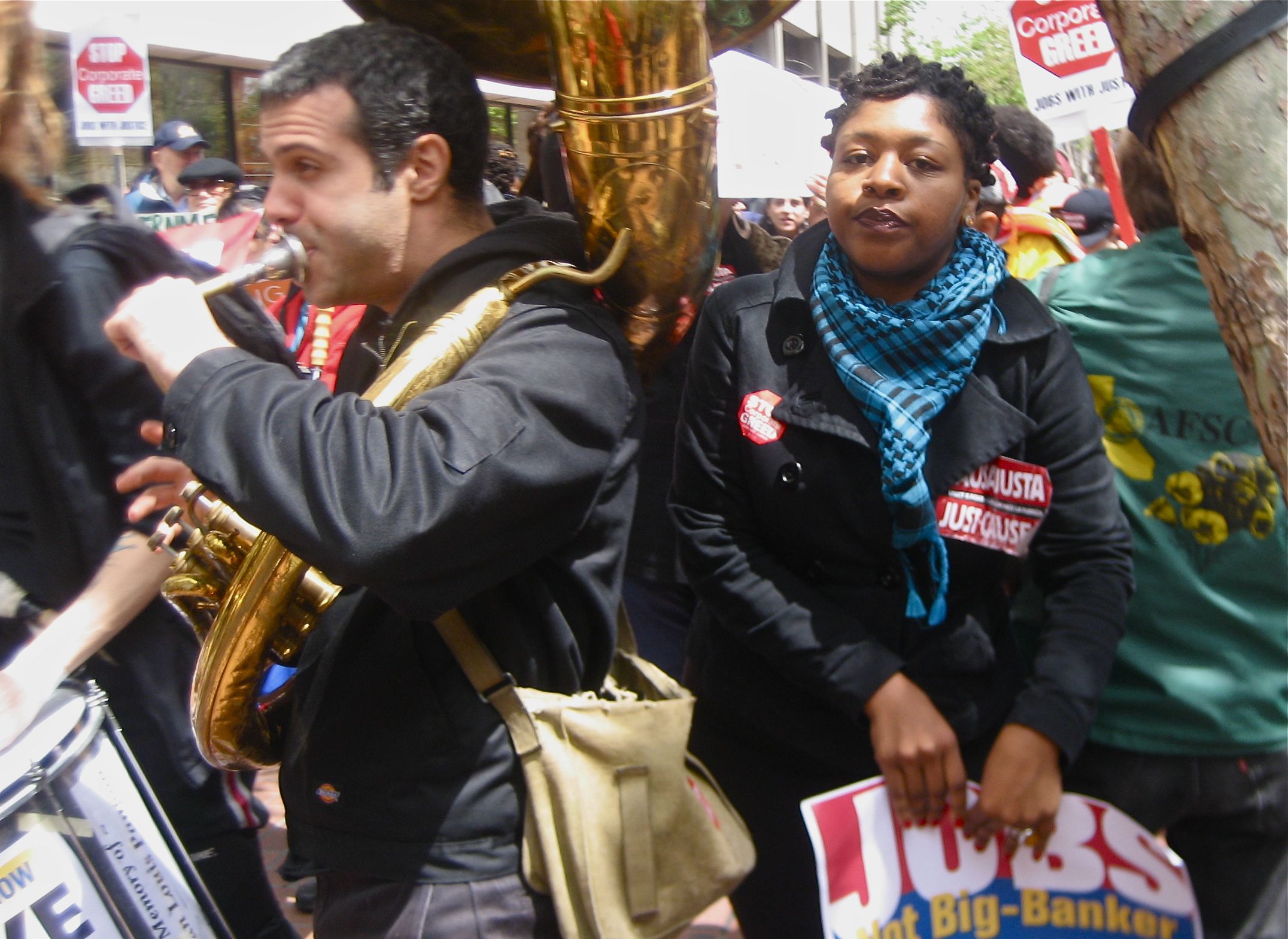 Well before the scheduled rally in Justin Herman Plaza to kick off a march through the financial district, small groups of supporters began gathering in light rain with umbrellas. By noon hundreds were on board, the rain lifted, and the clamor for justice began. By the time protesters reached the target of the main action, Wells Fargo's annual shareholders meeting, the decibel level was so loud that shareholders on the 15th floor could hear the chant: If we don't get no justice, you don't get no peace!