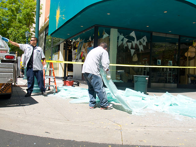 I was not at any portion of the event on Saturday, so I do not have photos from that night. The following photos were taken in the late morning of Sunday, May 2nd, as the graffiti and broken glass were being removed.