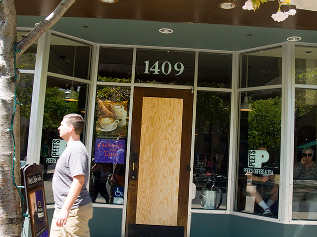11:15pm: Several expensive “hipster” stores, corporate chain stores, and bourgeois shops that cater to tourists had their windows smashed.