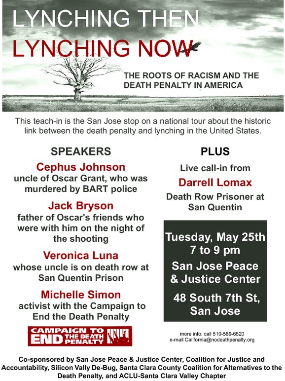 Sponsored by Campaign to End the Death Penalty. Co-sponsored by San Jose Peace & Justice Center, Coalition for Justice and Accountability, Silicon Valley De-Bug, Santa Clara County Coalition for Alternatives to the Death Penalty, and ACLU-Santa Clara Valley Chapter.