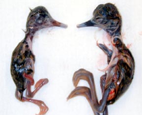 The legacy of agribusiness pollution: These are deformed embryos of the bird species Stilt collected from a single nest from a Tulare Basin evaporation pond in the Southern San Joaquin Valley in 2001. Selenium from west side San Joaquin Valley farms caused massive wildlife deformities in birds at the Kesterson National Wildlife Refuge, exposed by federal biologist Felix Smith, in Merced County in the early 1980s. Governor Arnold Schwarzenegger's lackeys on the Central Valley Regional Water Quality Board are expected to grant more pollution waivers to corporate agribusiness on May 27. Photo courtesy of U.S. Fish and Wildlife Service.