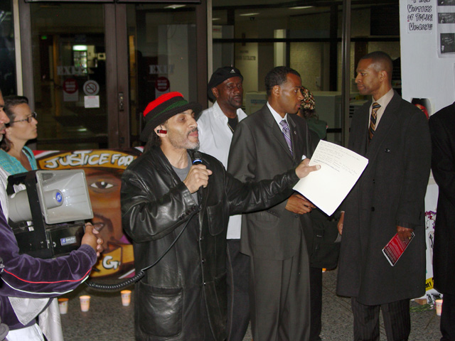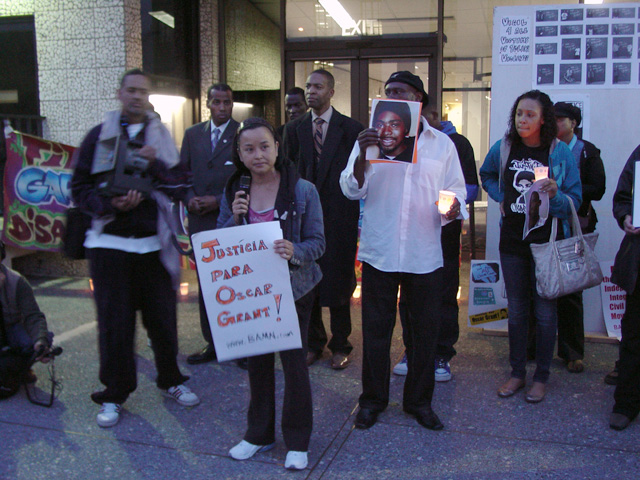 On the eve of the beginning of the trial of Johannes Mehserle for the murder of Oscar Grant in Los Angeles County, family, friends, and community activists gathered for a vigil for Oscar Grant and all victims of police violence. Those gathered solemnly recognized that the Judge overseeing the trial, Los Angeles County Superior Court Judge Robert J. Perry, has granted a number of requests from Mehserle's defense attorney Michael Rains intended to shift the blame to Oscar Grant for his own murder. The location of the vigil, in front of Alameda County District Attorney Nancy O'Malleys office, was chosen to remind the DA that Mehserle is the one on trial, not Oscar Grant, and that the community demands a vigorous prosecution. Those in attendance were also adamant that regardless of if the history of police not being held to account for their crimes against people of color plays out once again in the Mehserle trial, the fight for justice will continue. A mass community gathering has been called for 14th Street and Broadway in Oakland at 6pm the day the Mehserle verdict is announced.