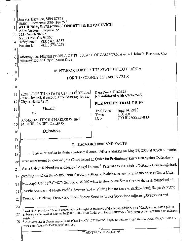 A costly and unusual trial to permanently ban two homeless musicians--Anna Richardson and Miguel de Leon--is taking place in Dept. 4 daily costing the city tens of thousands of dollars. The two have been convicted of no crimes in the last year except being visible in public spaces as "eyesores" and responding angrily to
