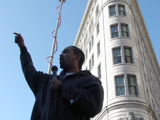 As a crass incentive to avoid the 14th and Broadway assembly, cash payments from the city were doled out by NGOs to those who showed up or brought others with them to the various NGO events. No matter, as even Oakland Councilmembers were seen in the street at the community speak-out rather than at their own event on the steps of City Hall on the other side of Frank Ogawa Plaza. Likewise, Youth Uprising, amongst the NGOs sponsoring city-approved "healing centers" intended to dilute any potential angst by spreading it across the city, couldn't avoid attending the community gathering themselves. And this was the closest the community event came to being co-opted or compromised from being a 100% authentic, grassroots speak-out held on its own terms -- that Youth Uprising obviously sent a number of young people to speak at the community gathering to parrot the official line that "violence is not justice" as they had done in their ham-handed PSA that offensively equated the murder of Oscar Grant with property destruction. (They weren't very covert about their presence, several having brought with them a grip of glossy Youth Uprising "Violence is not justice" handbills.) Nevertheless, even Youth Uprising's small contingent of young people were graciously allowed to take the microphone along with dozens of others, none of whom were censored.