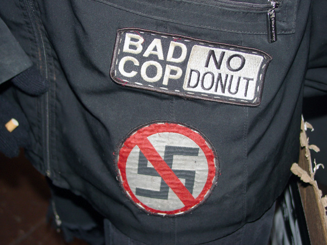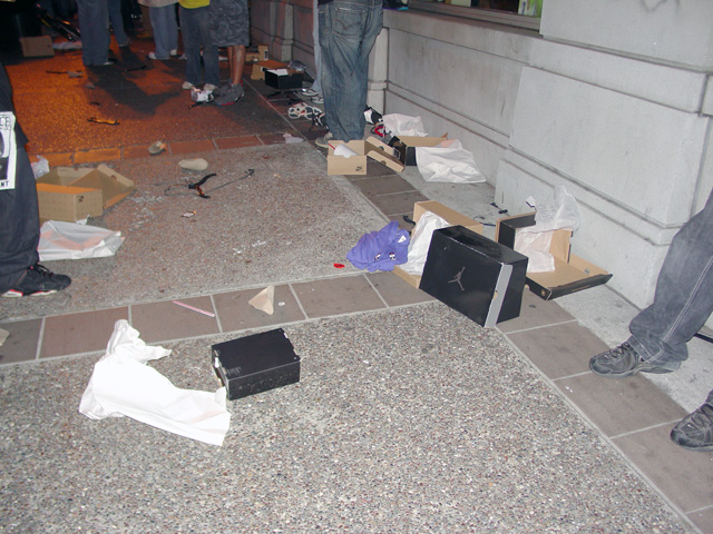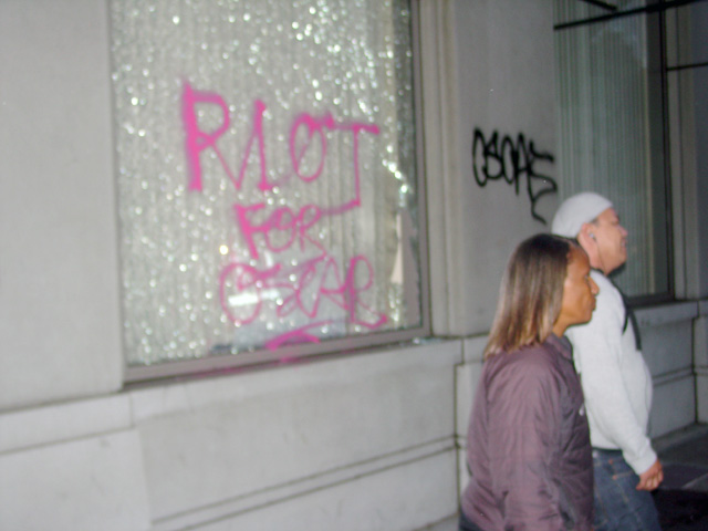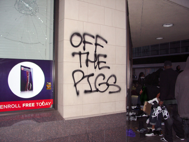 As dark began to set in, graffiti went up and windows were broken on Broadway between 14th and 15th Streets. A number of people pushed through the metal gates protecting the Foot Locker store and began to throw individual shoes in the air over the crowd. Police were obviously aware of what was happening as they had a line at 15th and Broadway, as well as snipers and lookouts on rooftops and presumably undercover officers in the crowd, yet they did nothing. Eventually, box after box of shoes and other sporting gear began to come out of the store. Some attempts were made to ignite empty shoe boxes strewn throughout the block.