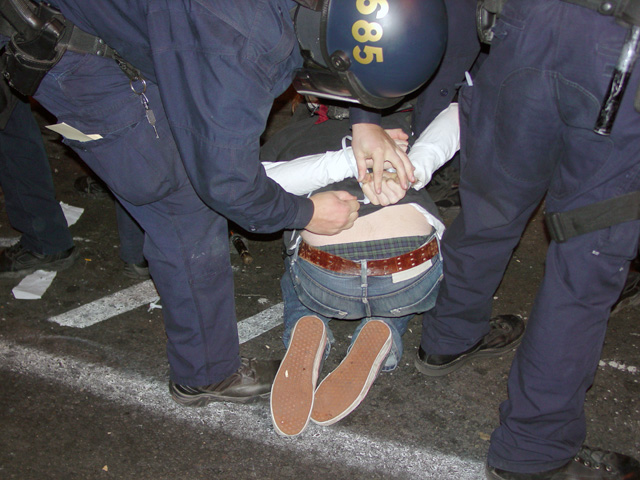It wasn't until nearly an hour after the community gathering concluded that police formed a line on 14th just west of Broadway, donned gas masks, and made an announcement about an illegal assembly that could not be heard by those on Broadway. As the police line moved toward Broadway and rounded the intersection at 14th, turning north, a voice on a loudspeaker could be heard commanding officers to "make arrests, make arrests" as they slowly moved forward. Police began to tackle random people, using their nightsticks, with multiple officers piling onto each individual they targeted, pushing them into the pavement. Several bloody faces were seen as police lifted arrestees to take them away.