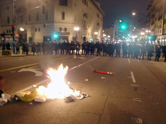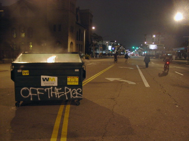 From there, most of the crowd had managed to squeeze through the opening into Frank Ogawa Plaza while others made it further up Broadway and Telegraph where more graffiti went up, more windows were broken, at least three additional stores had merchandise expropriated, and several dumpsters and trash cans were set on fire. Before midnight, those in the streets had largely dispersed and police set up lines at various intersections and marched through downtown in large platoons.