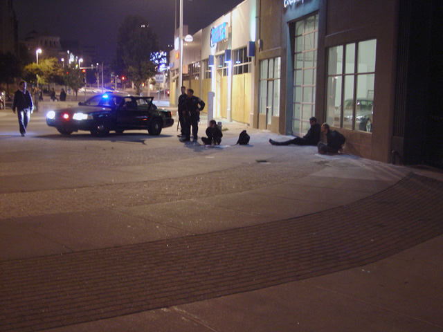 At the conclusion of the community gathering at 14th and Broadway on the day the Involuntary Manslaughter verdict for Johannes Mehserle was announced, Oakland police, backed up by forces from across the region, had amassed up to 1000 officers, most in some form of riot gear, blocking the main exit points from the area. The hundreds of police who had been lined up at 12th and Broadway pushed the crowd north, closing in the area people had to gather. While there were mumblings of a march by those in the crowd, there was no where to go, except to squeeze through the narrow corner entrance to Frank Ogawa Plaza.