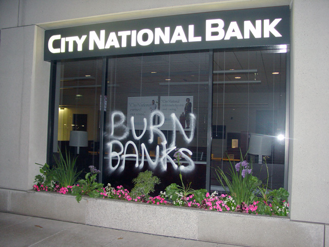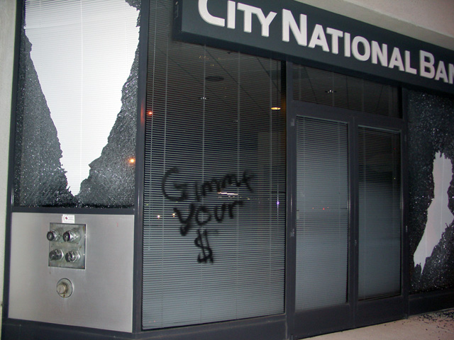 Surveying the damage after the streets were more or less cleared of everyone but police and a few dozen gawkers on July 8th, it was clear that most of the businesses that had been attacked were either banks or corporate chains. The stores that had merchandise expropriated included the Foot Locker and the downtown Sears, as well as a locally owned beauty supply store and a jewelry store. Broken windows and graffiti were seen throughout downtown. The dumpsters and garbage cans set on fire earlier had been extinguished or burned themselves out. The Oakland police department reported arresting 78 people that night, although charges were later dropped against most of them. At least thirteen people remain in jail on charges or parole violations.