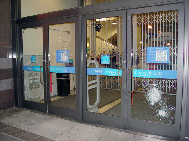 [Pictured above, Whole Foods grocery on Harrison Street had several windows broken on the Vernon Street side of the store.]
